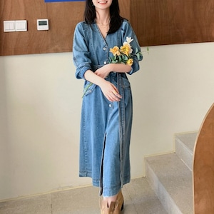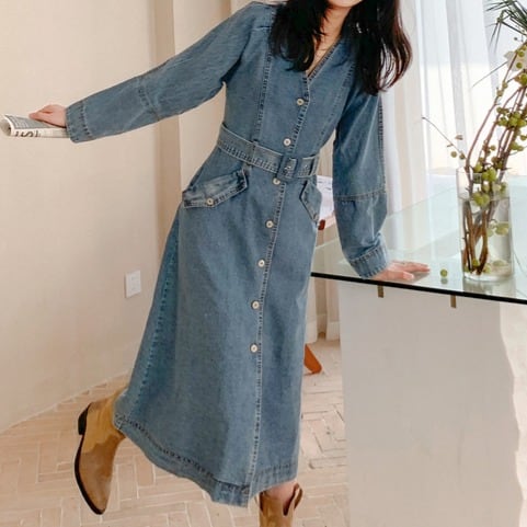 デニム素材でありながら、Vネックとロング丈のデザインが女性らしさを演出するワンピースです。