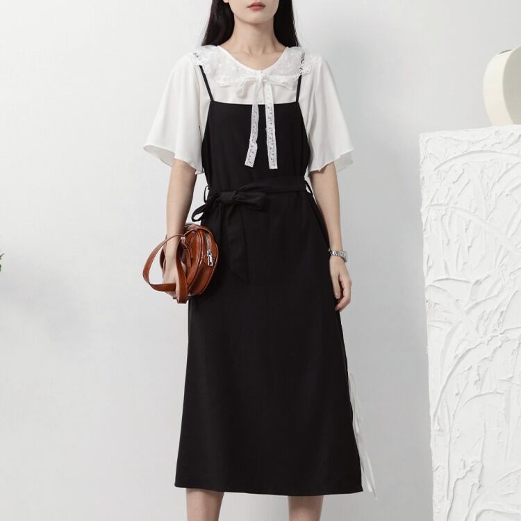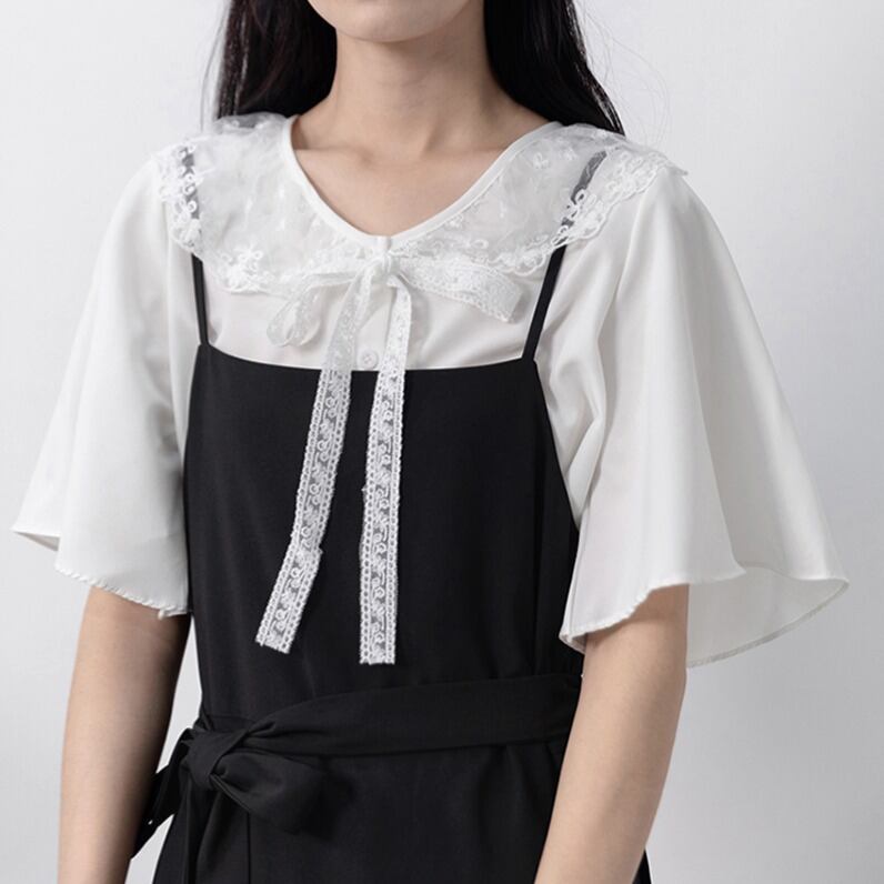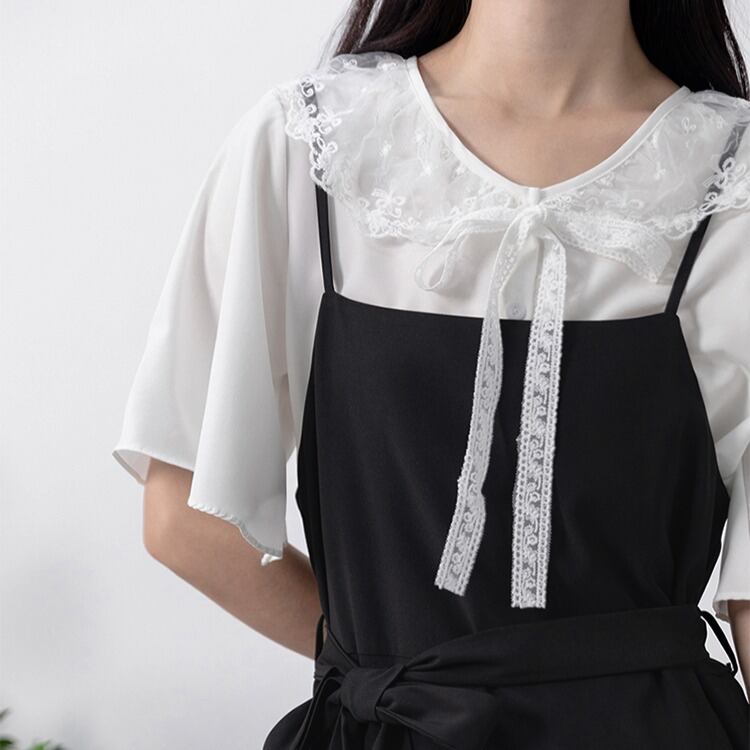 レース襟ボウタイVネック半袖シャツブラウス 00106