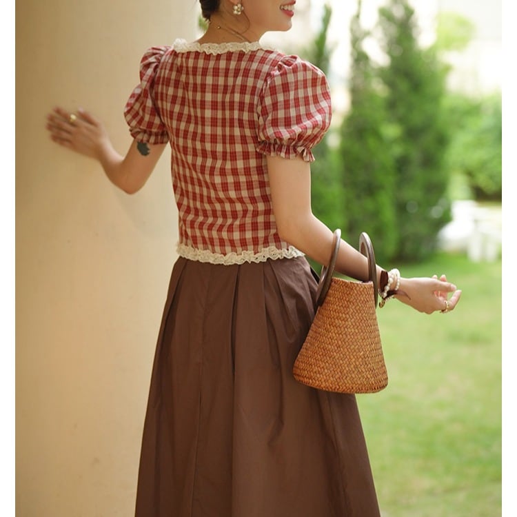 ギンガムチェック 半袖パフスリーブ ボウタイブラウス 00237