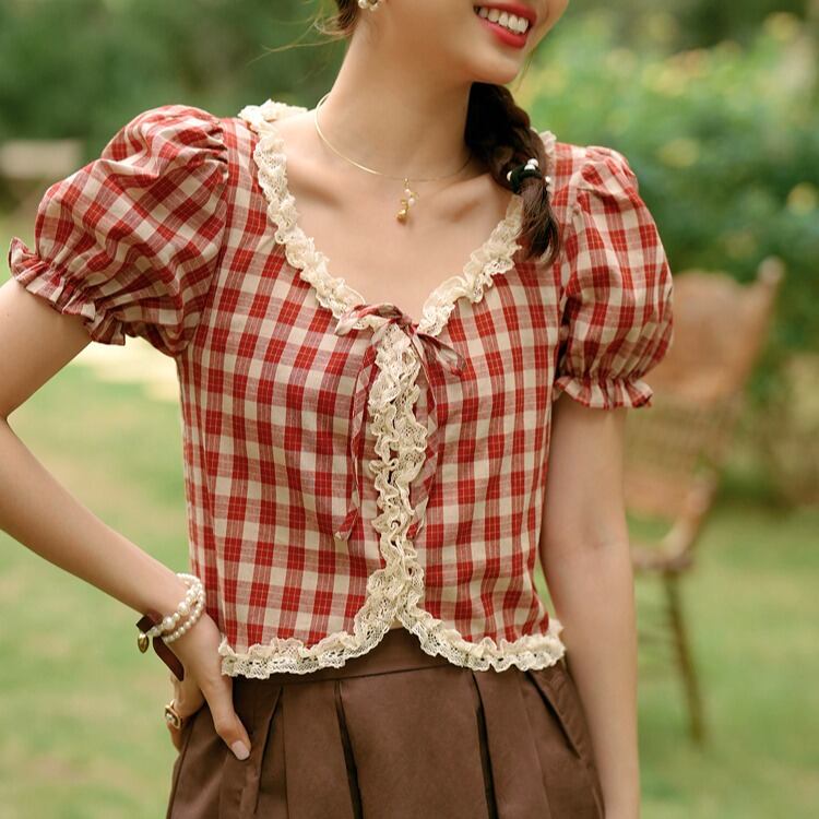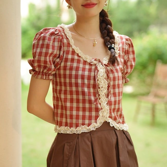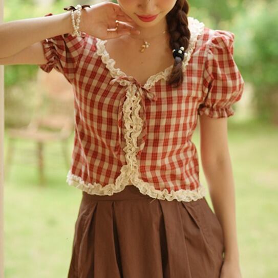 可愛らしいギンガムチェック柄と、女性らしいレースの組み合わせが魅力のブラウスです。