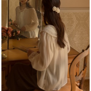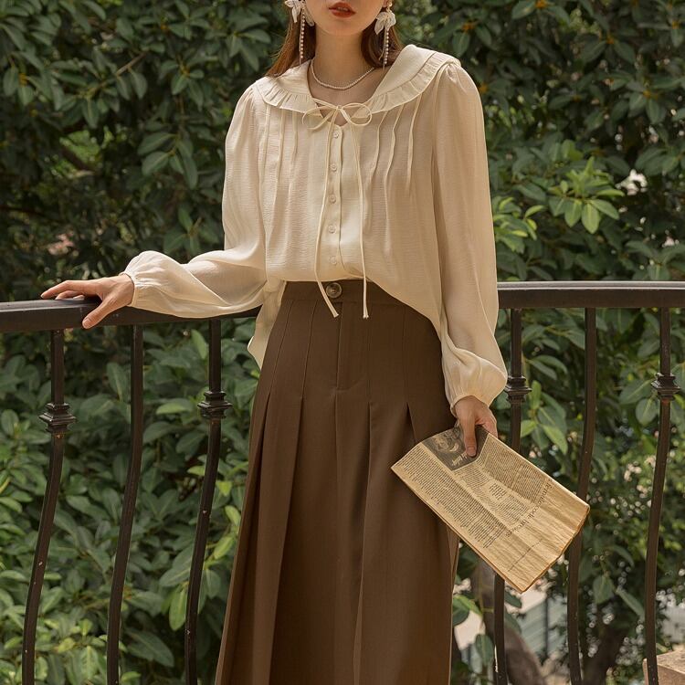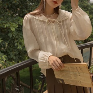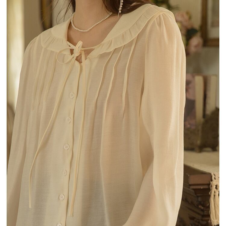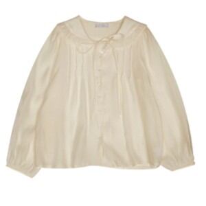可愛らしいフリルカラーと、上品なリボンが魅力のブラウスです。