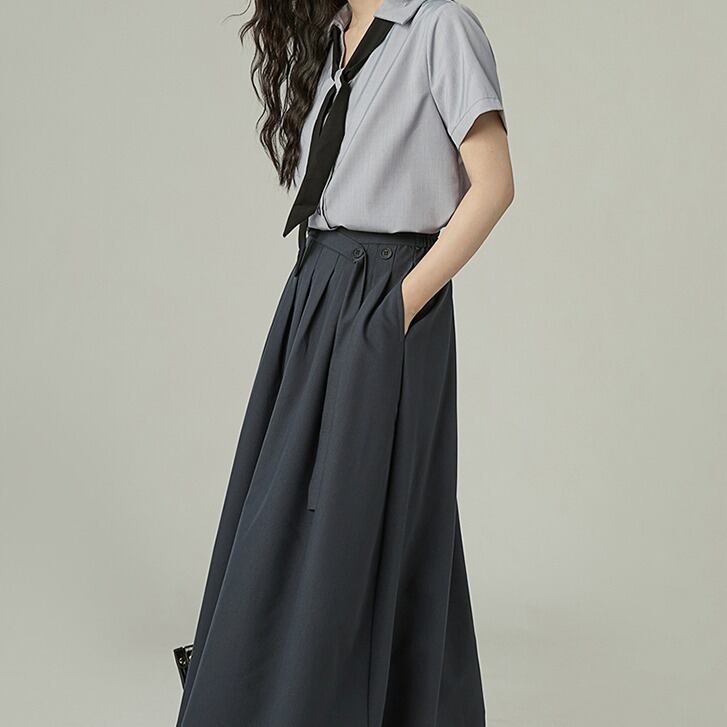 ボウタイがポイントのハーフスリーブブラウスは、シンプルながらも存在感のあるデザインが魅力です。