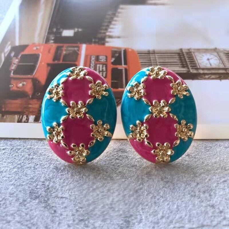 鮮やかなグリーンとネイビーのチェック柄に、ゴールドのアクセントが輝くオーバル型のピアスまたはイヤリング。