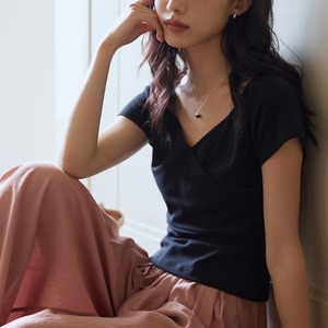 Vネックとクロスデザインが上品な印象を与えるフレンチスリーブTシャツ。