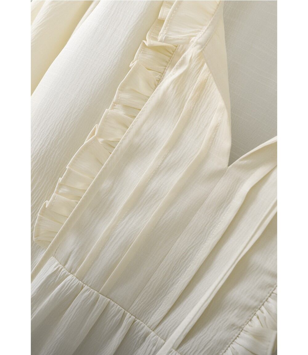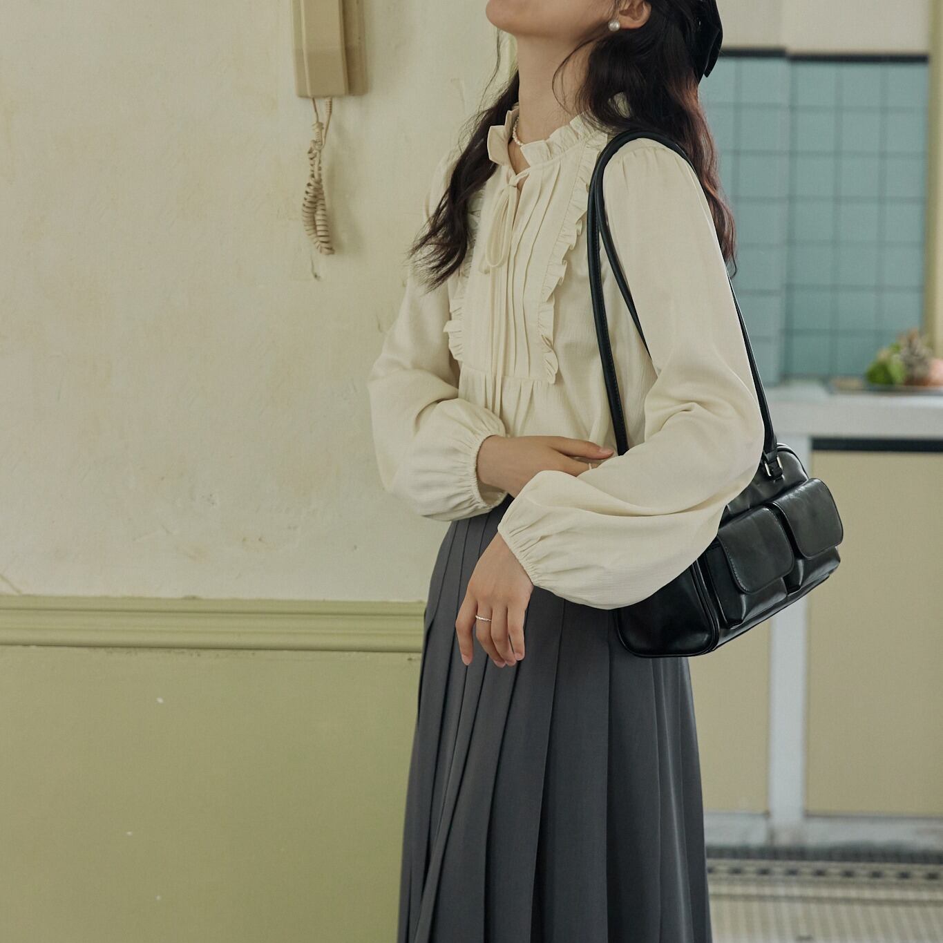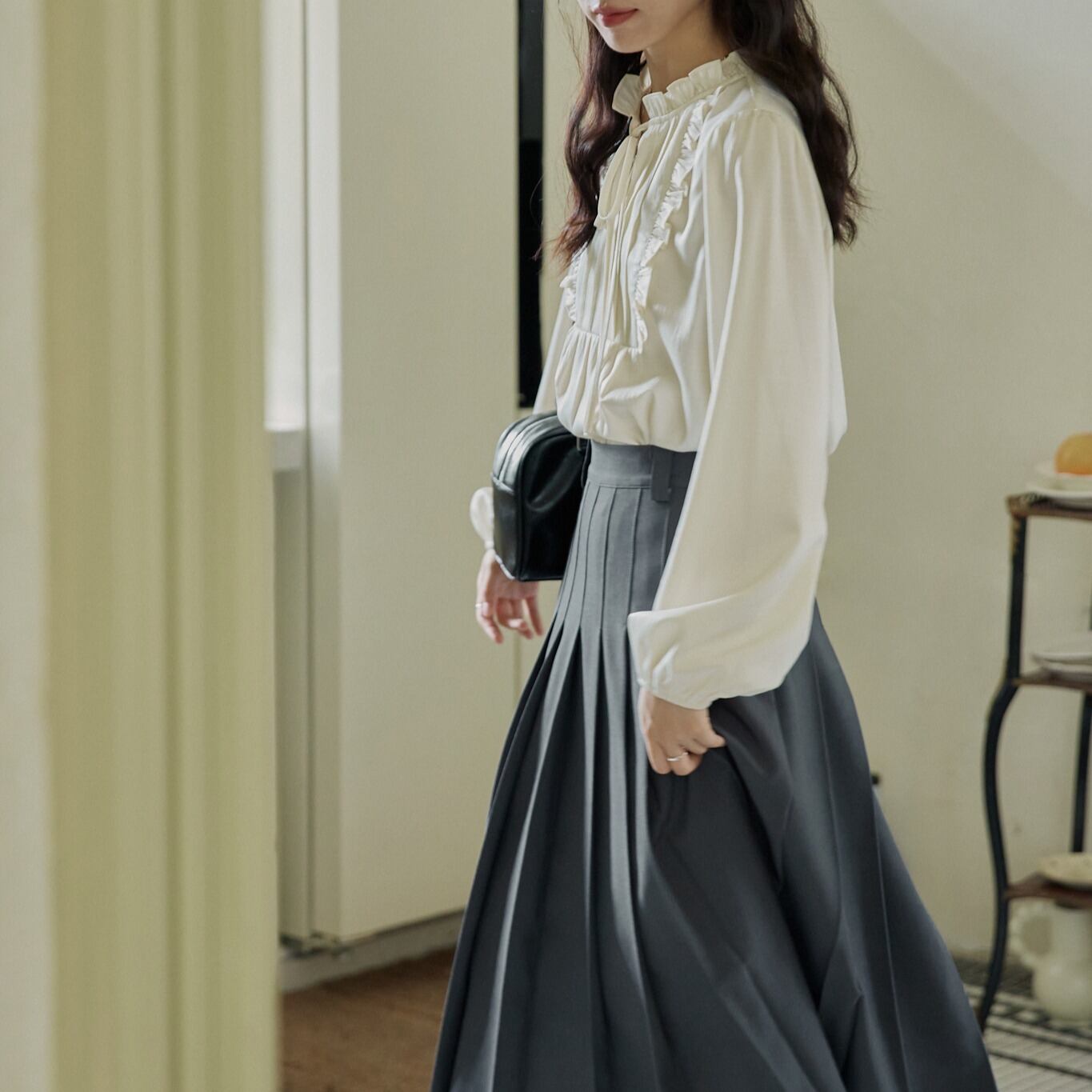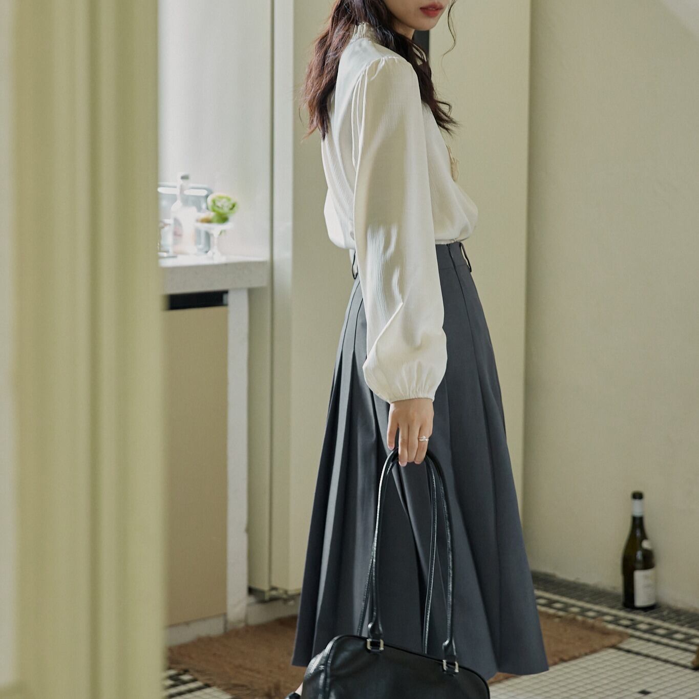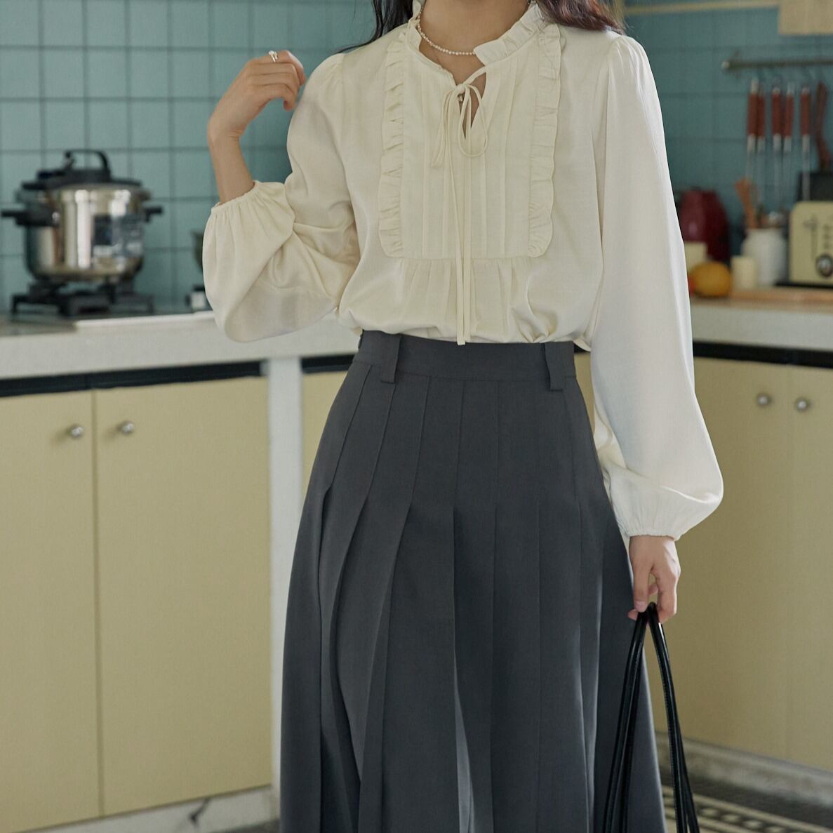 上品なスタンドカラーと繊細なリボンタイが特徴のブラウスです。