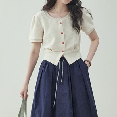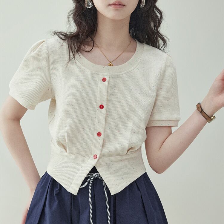 フロントボタン ラウンドネック クロップド 半袖カットソー 00300