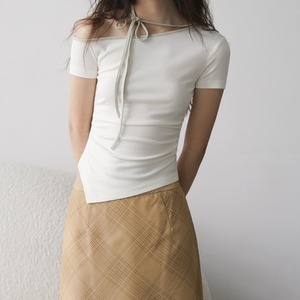 タイネックとアシメトリーヘムが特徴的なショートスリーブトップス。