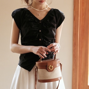 シャーリング Vネック フレンチスリーブトップス 00365