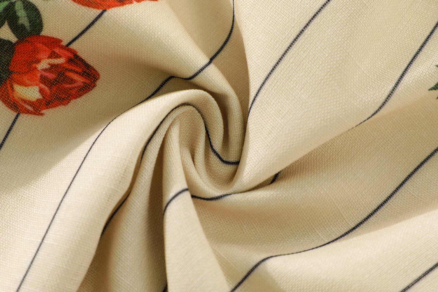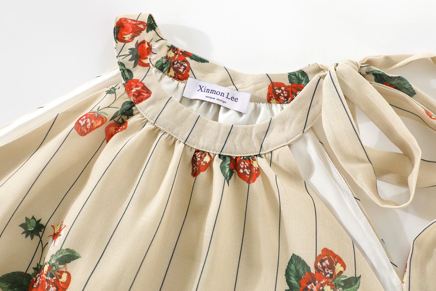 爽やかなストライプ柄に、愛らしいイチゴのプリントが散りばめられたノースリーブトップス。