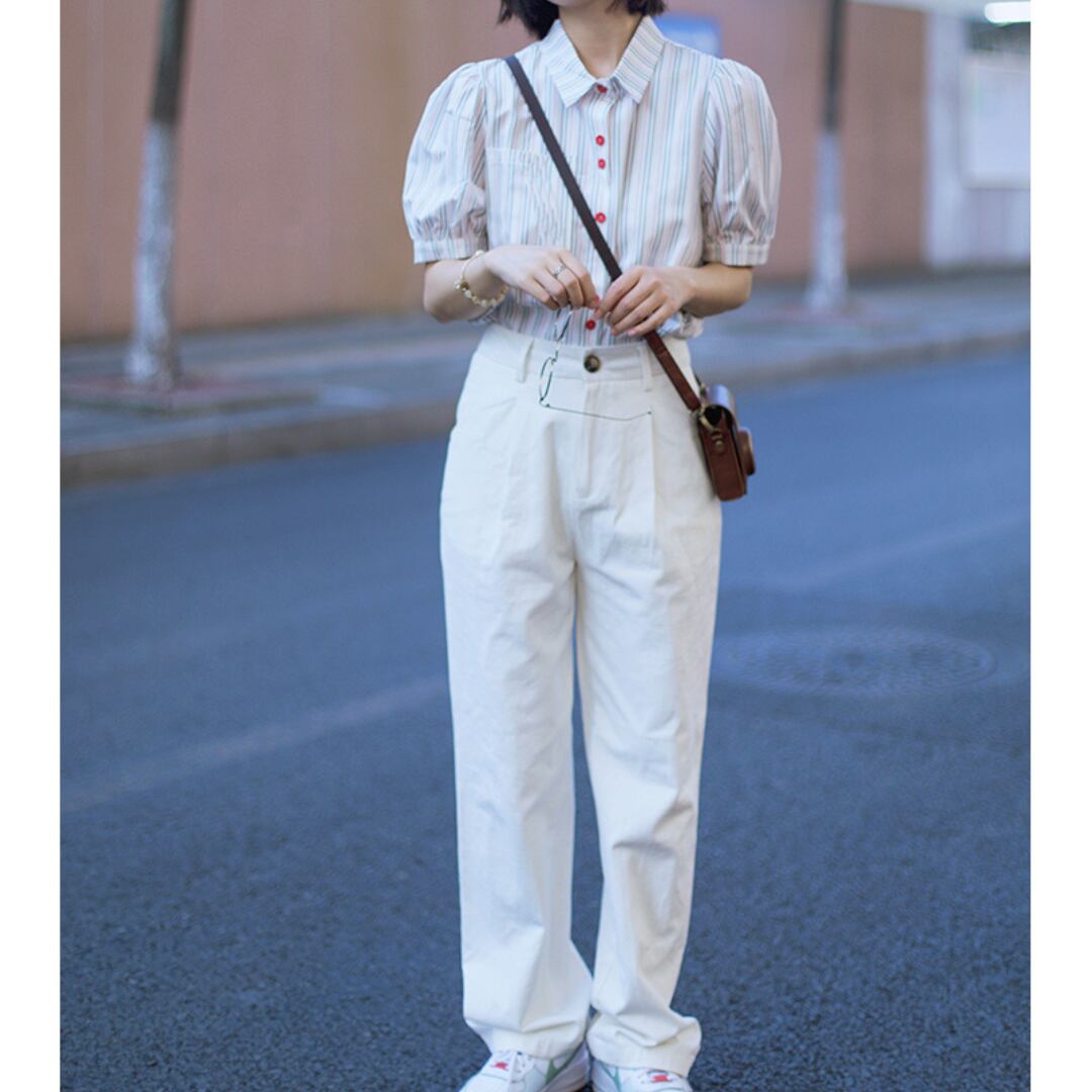 ストライプ アクセントボタン 半袖パフスリーブシャツ 00372