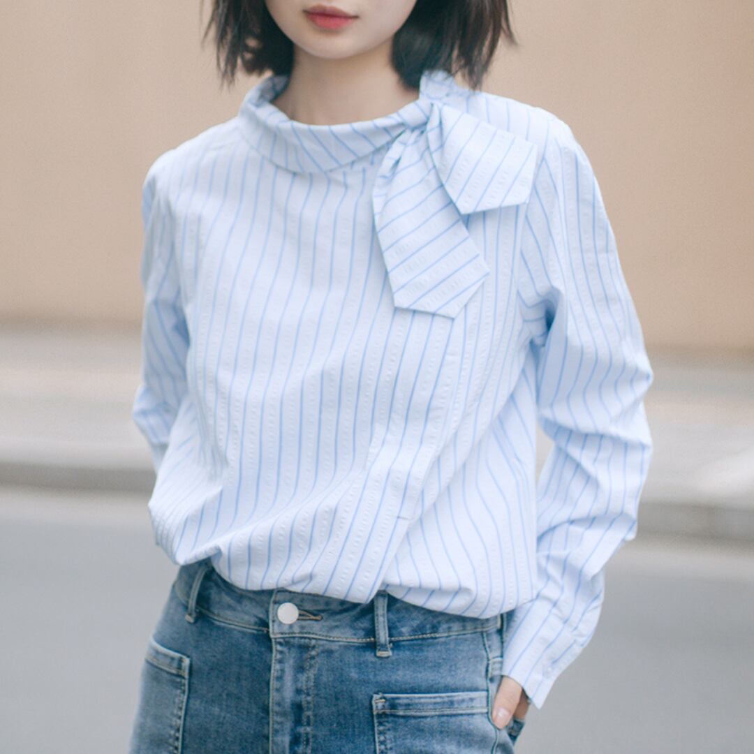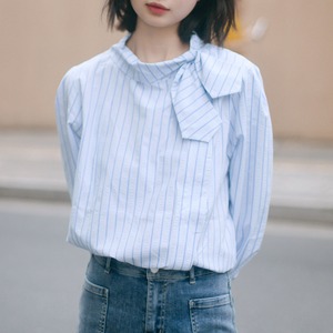 スタンドカラーとボウタイが上品な印象の長袖シャツです。