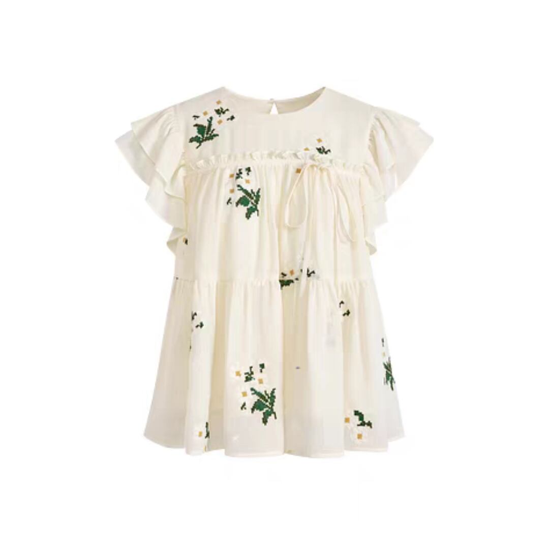 花柄刺繍入りリボンモチーフ 半袖シフォンブラウス 00382