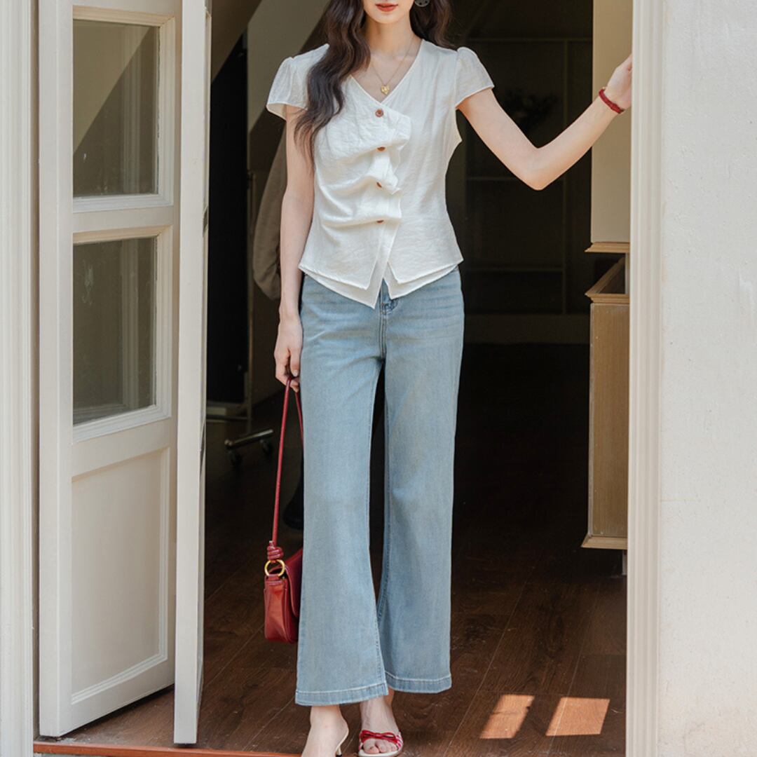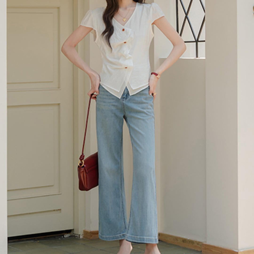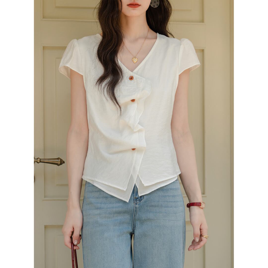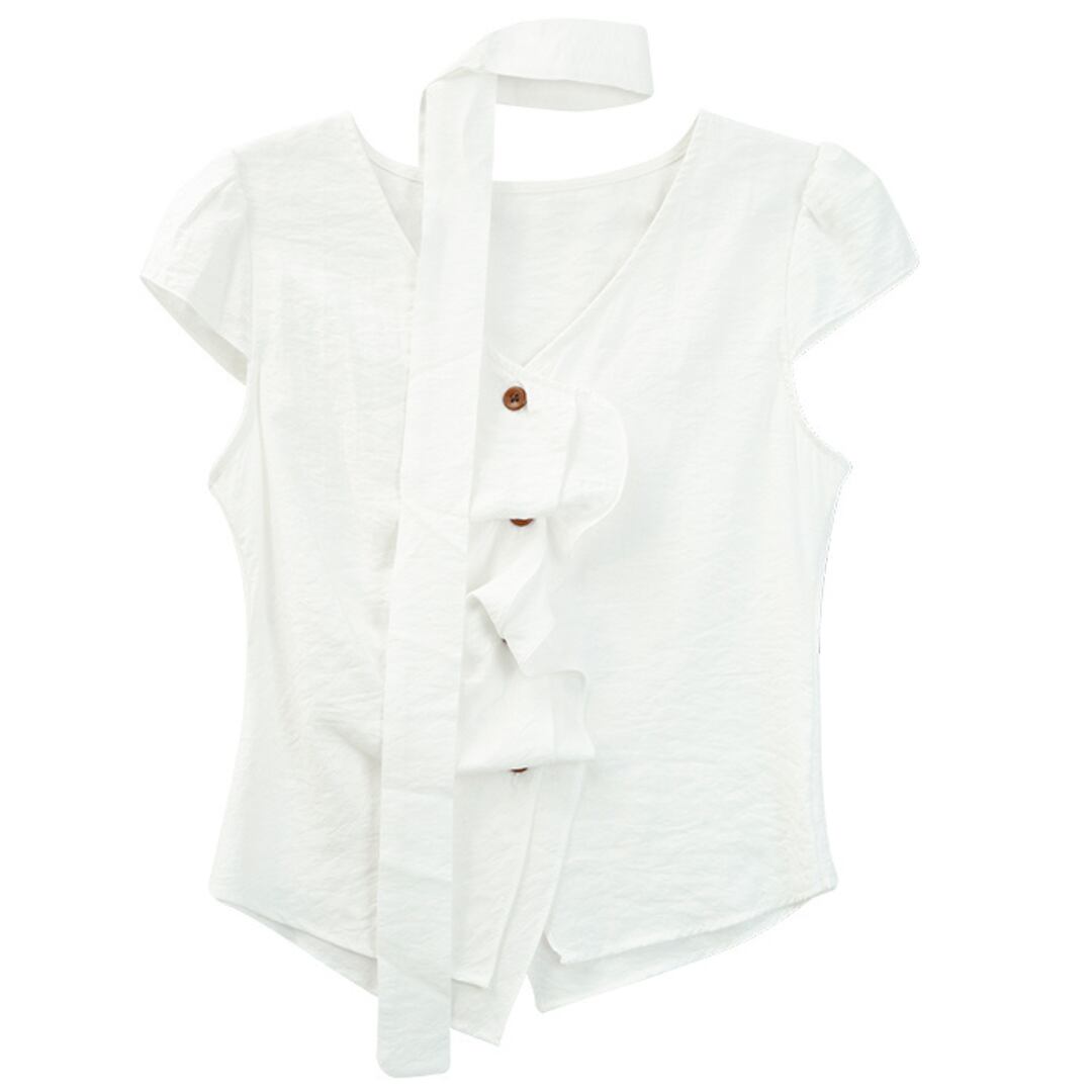 シンプルながらも、どこか個性を感じさせるフロントデザインが魅力のトップスです。