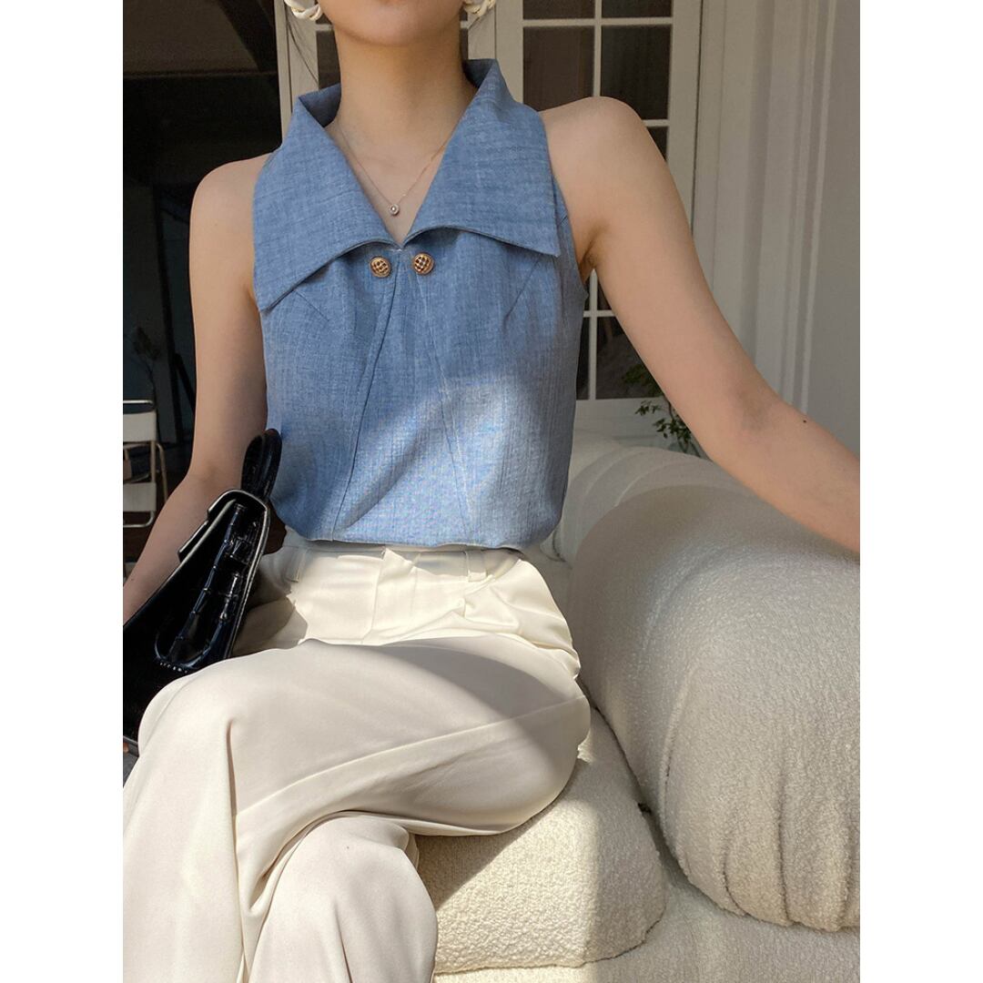 大きめな襟付きノースリーブトップスは、シンプルながらも洗練されたデザインが魅力です。