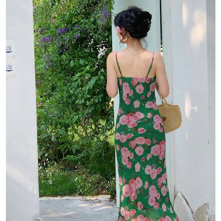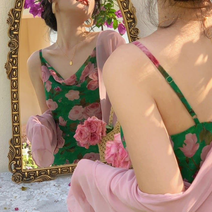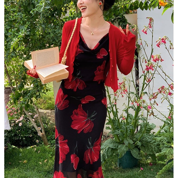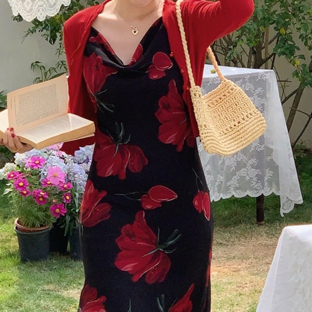 華やかながらも落ち着いた印象の花柄プリントが特徴のミディ丈ワンピース。