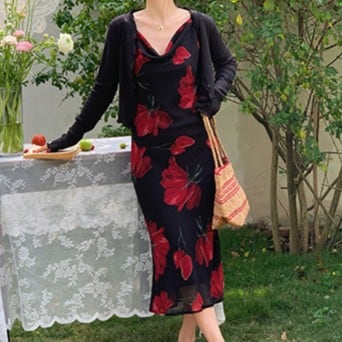 モダンフラワー柄 Iラインワンピース 00426