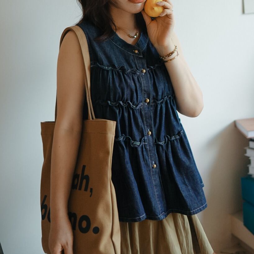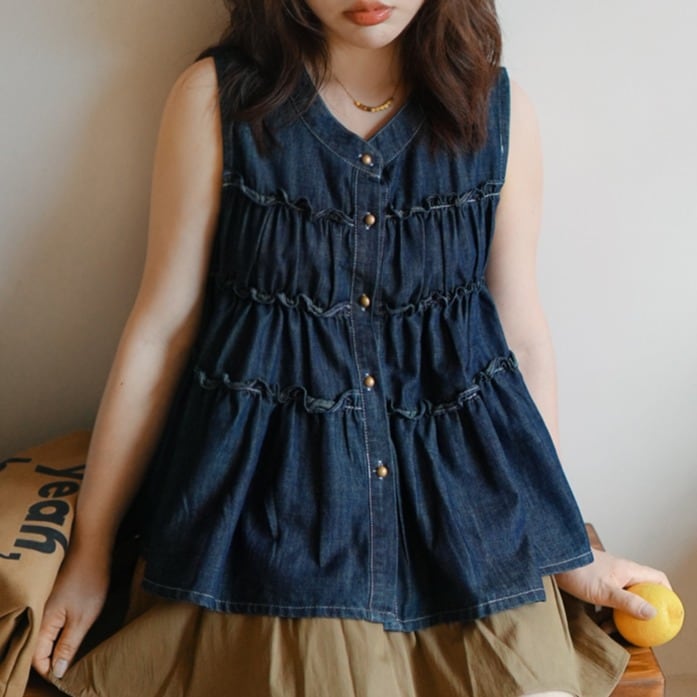 デニム素材  シャーリングデザイン ノースリーブトップス 00443
