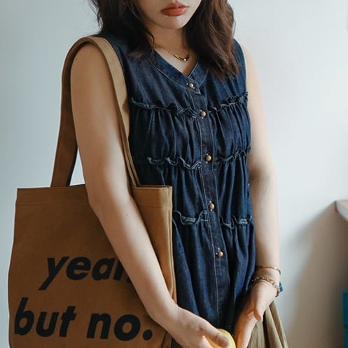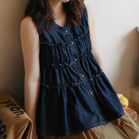 デニム素材 シャーリングデザイン ノースリーブトップス 00443