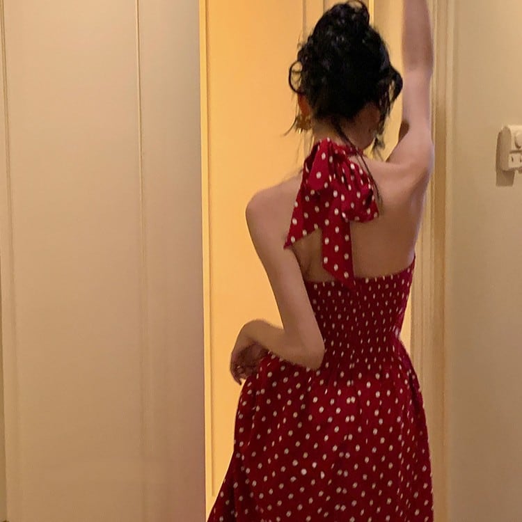 ドット柄 バックリボン  ホルターネック Aラインワンピース 00453