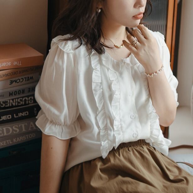 フリルネック パフスリーブ ハーフスリーブブラウス 00449