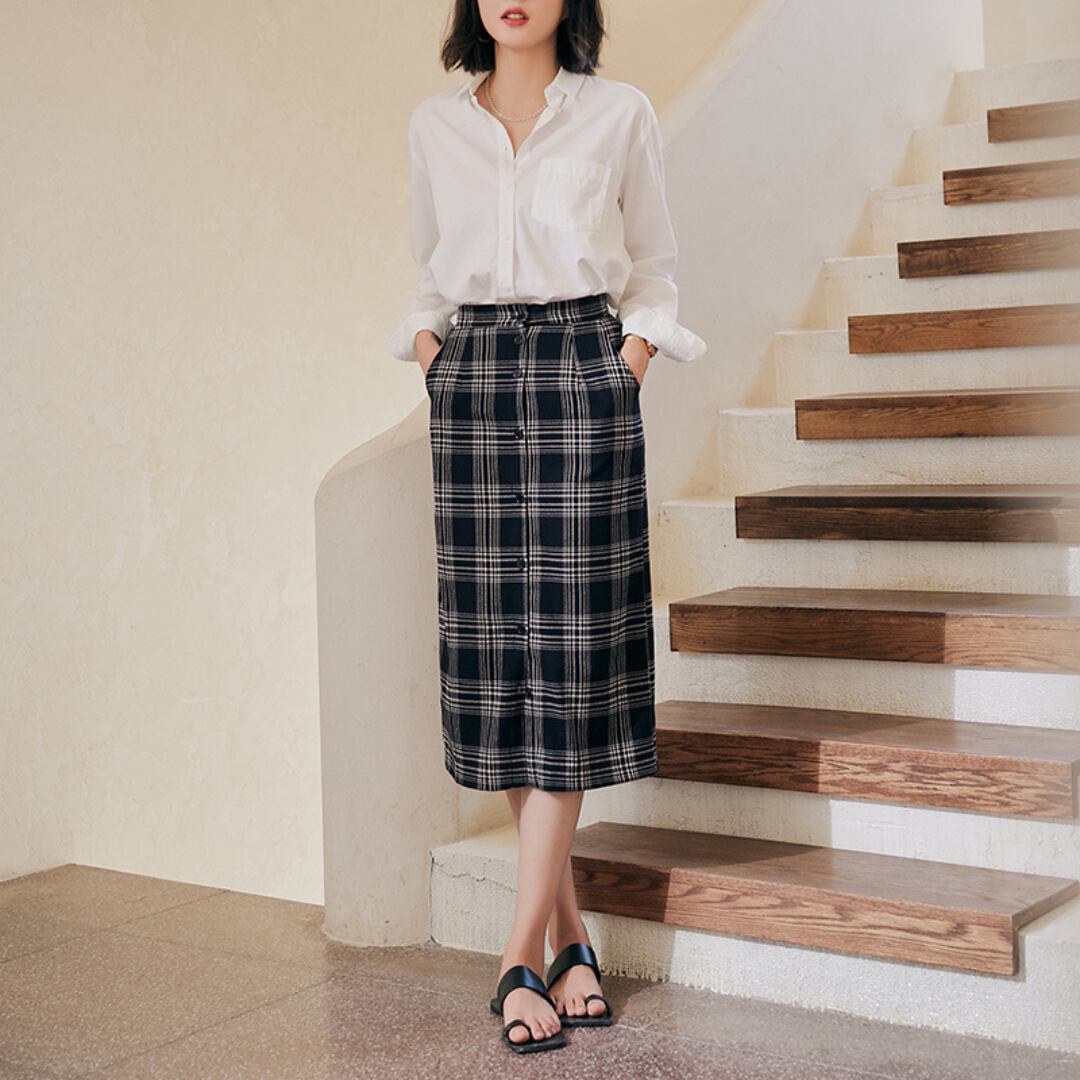 チェック柄 フロントボタンデザイン ミディ丈タイトスカート 00540