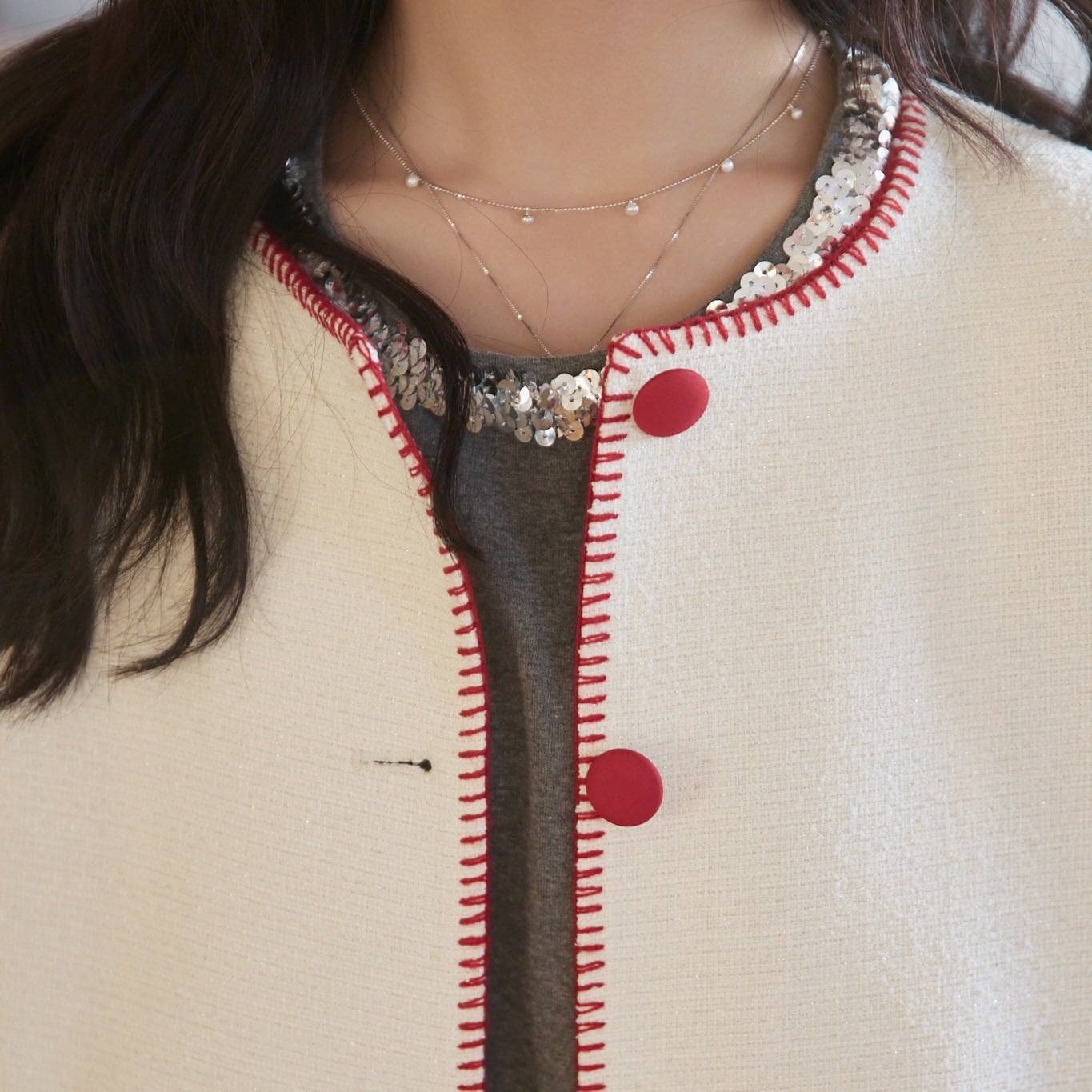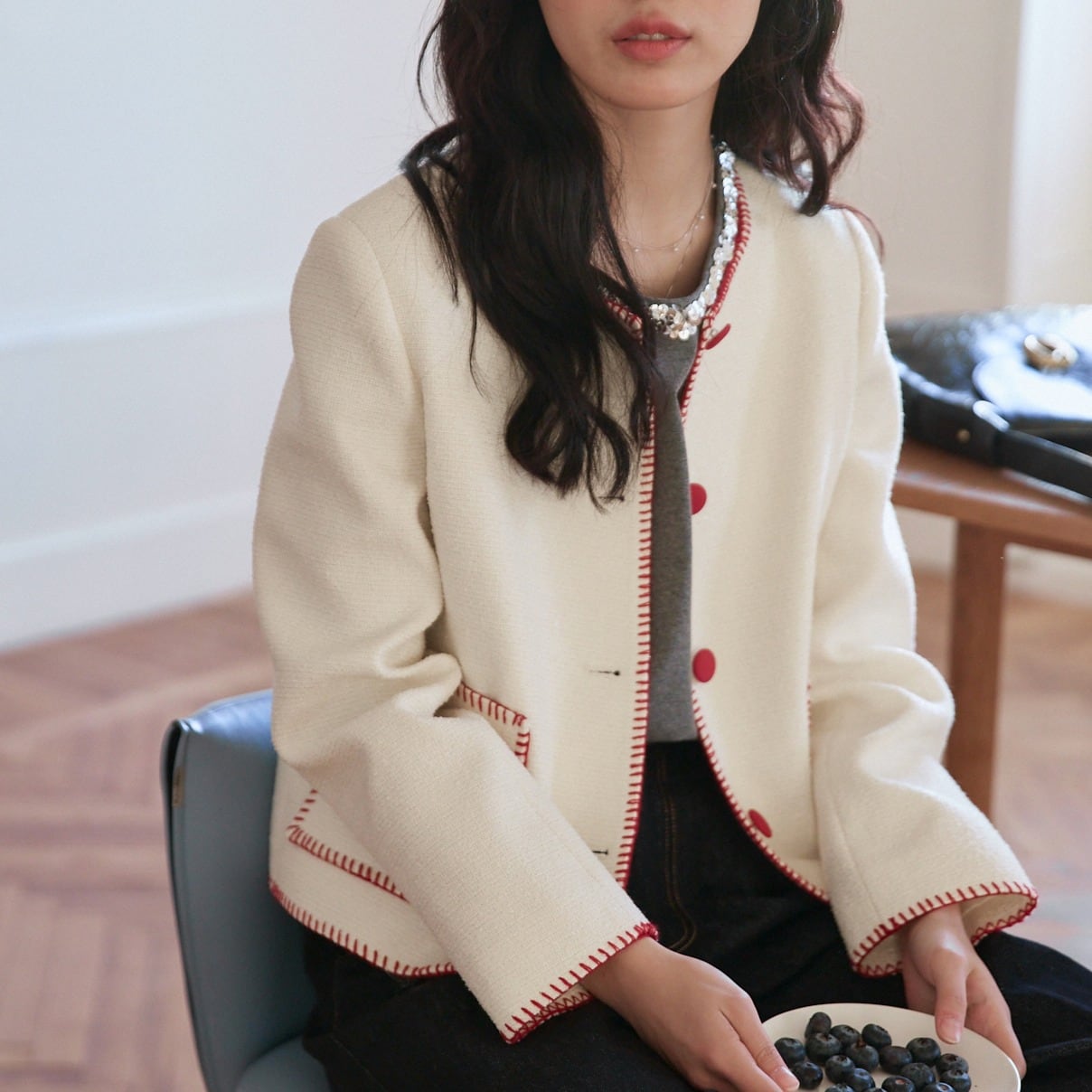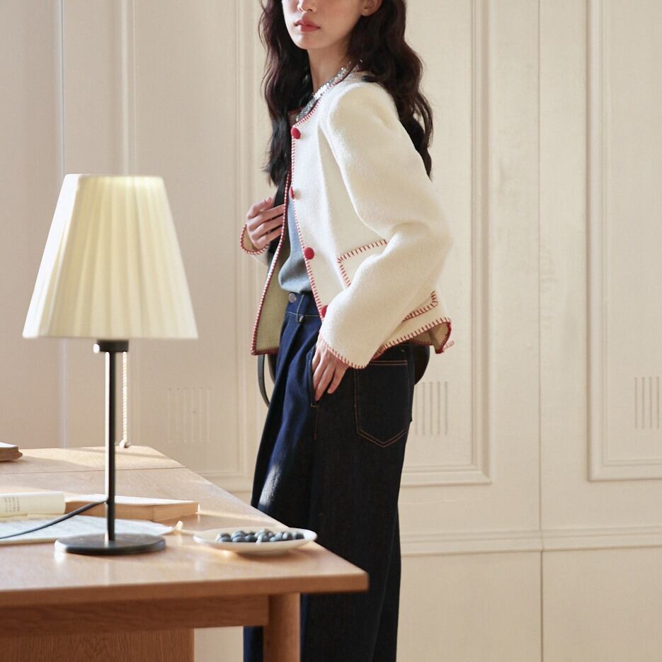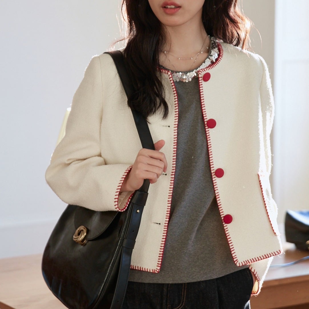 ステッチデザイン フロントボタン ラウンドネック ツイード調ジャケット 00366