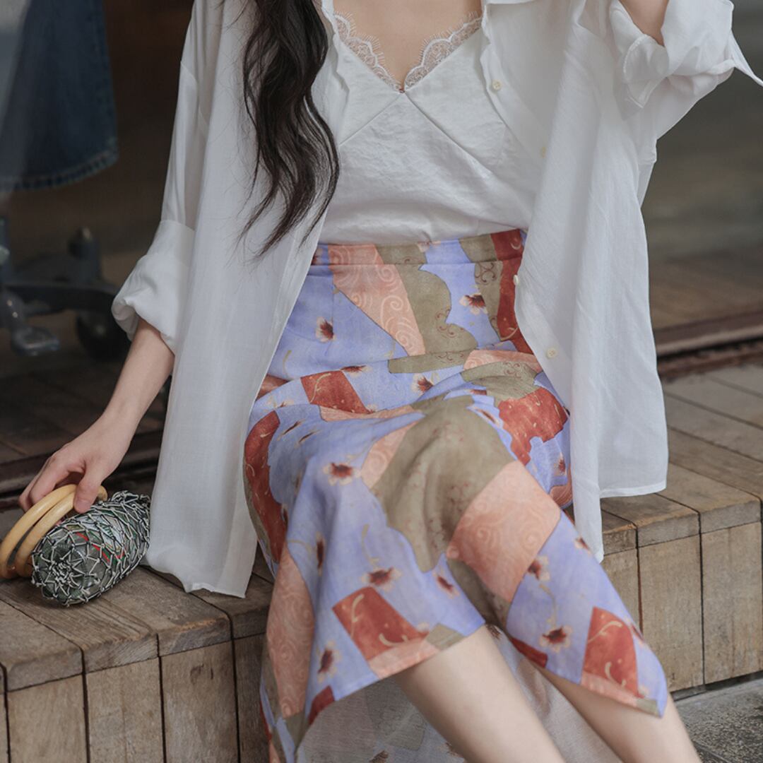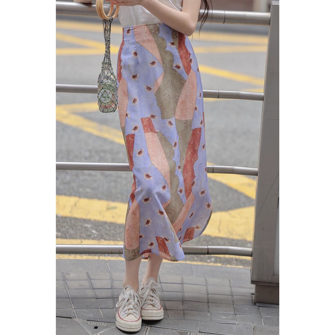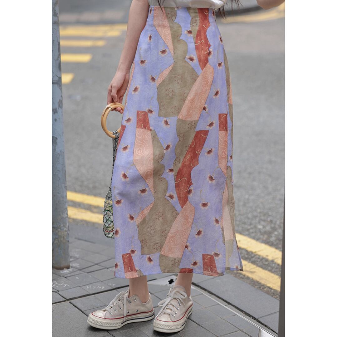 抽象柄×Aライン ハイウエスト スリットスカート 00547