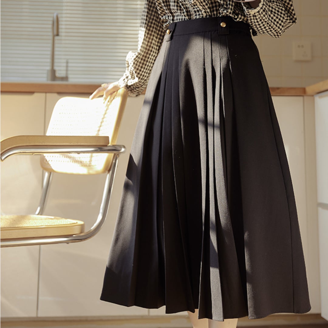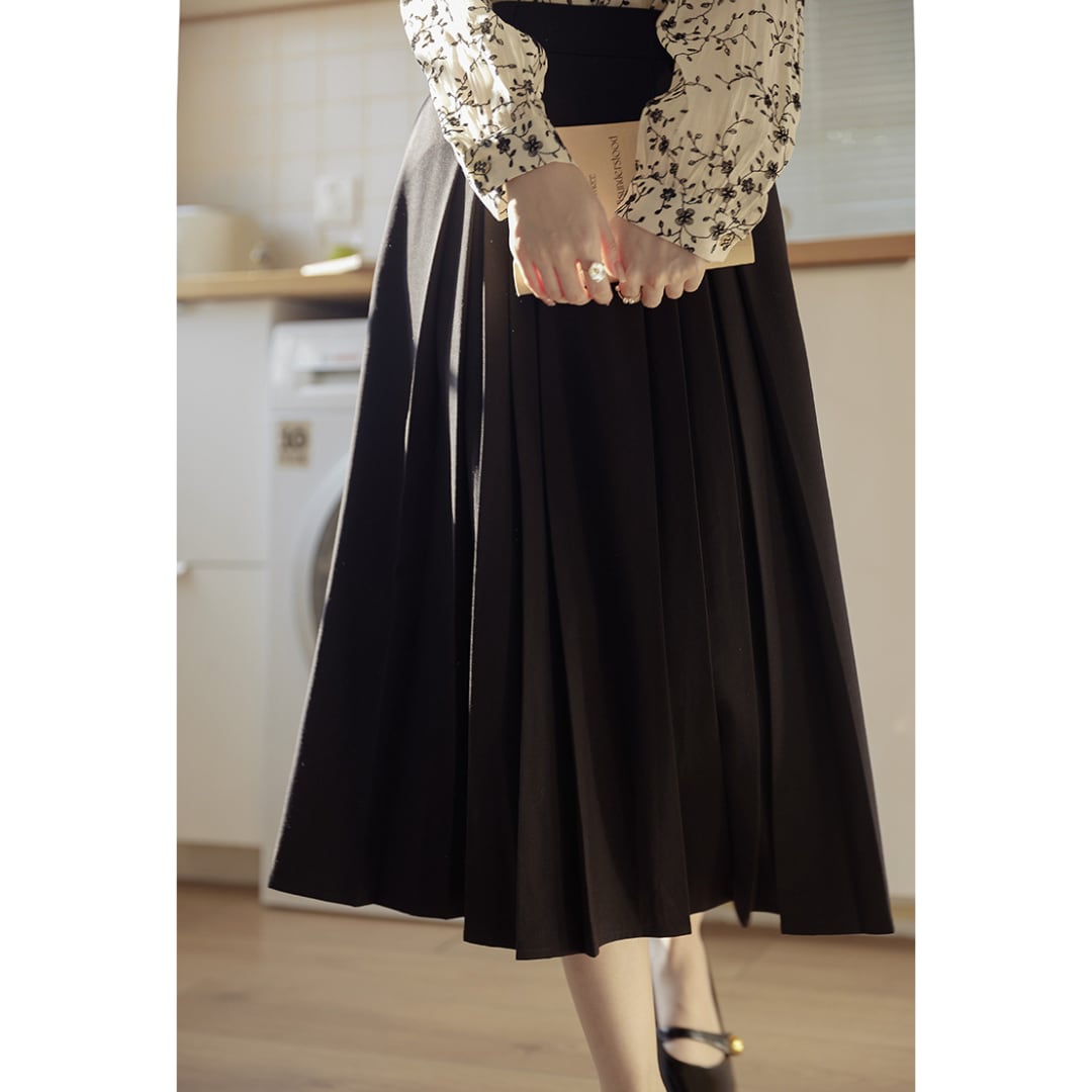 Aラインとプリーツのデザインが、ほどよく品のあるコーデに仕上げてくれます。