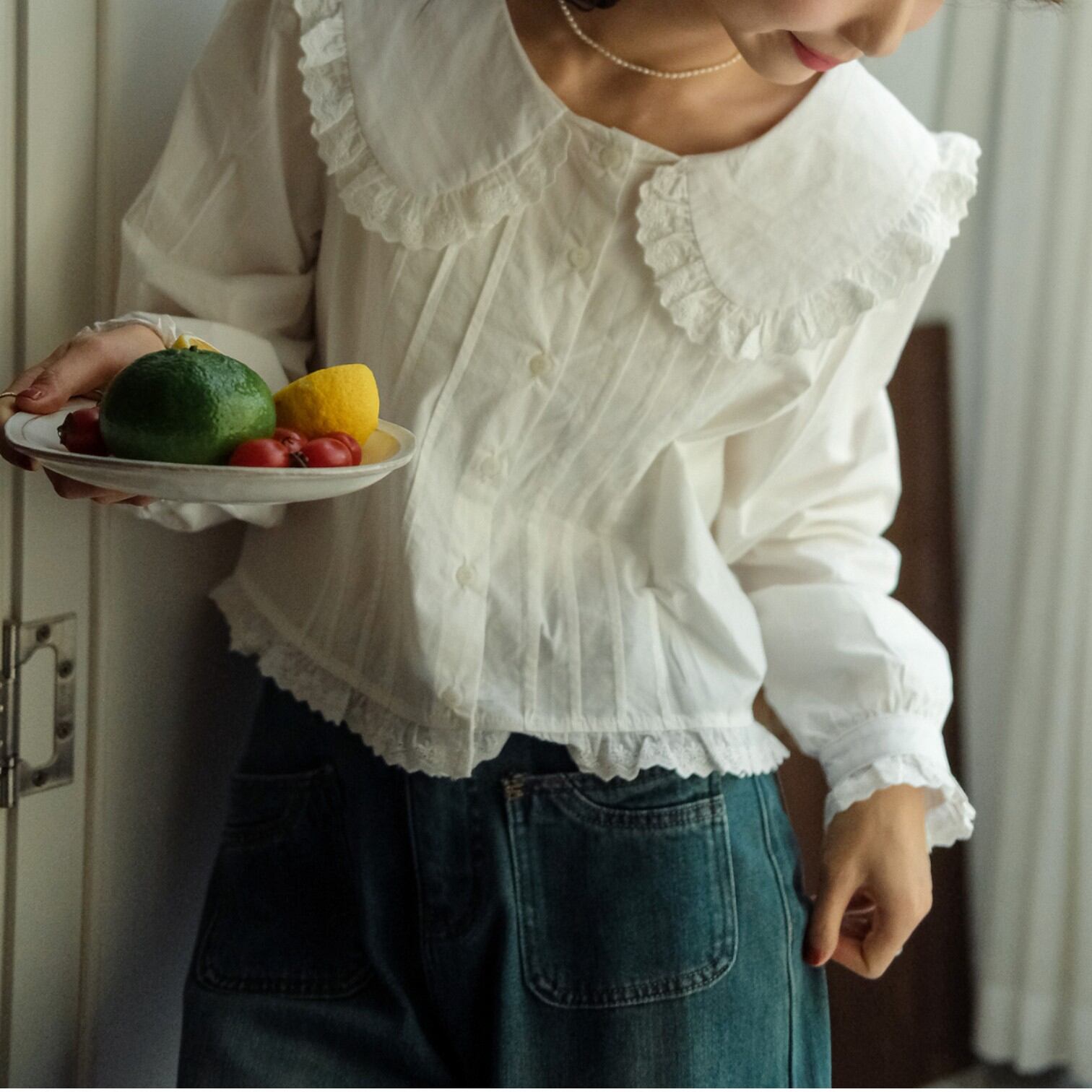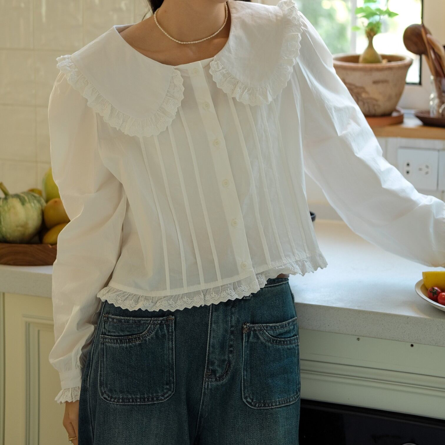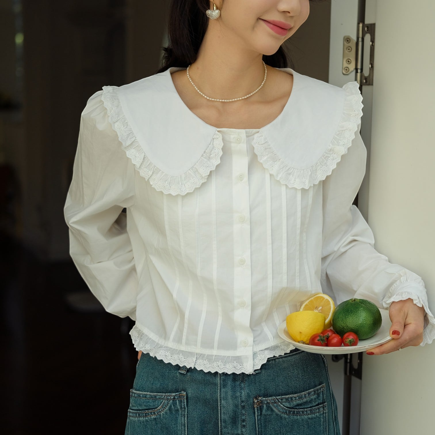 フリルデザイン 丸襟 クロップト丈 ロングスリーブブラウス 00463