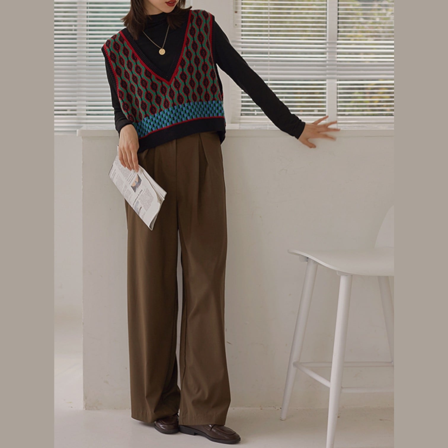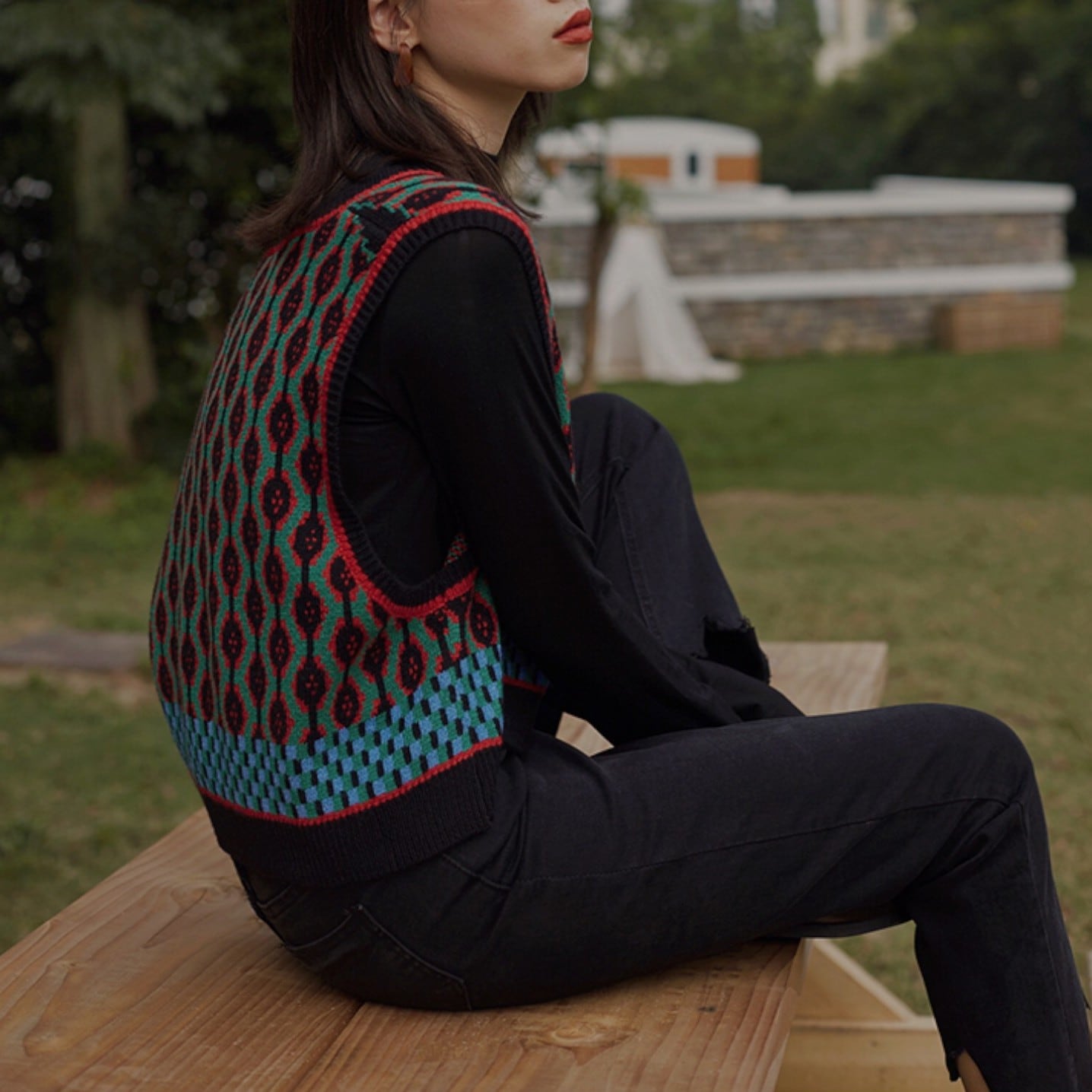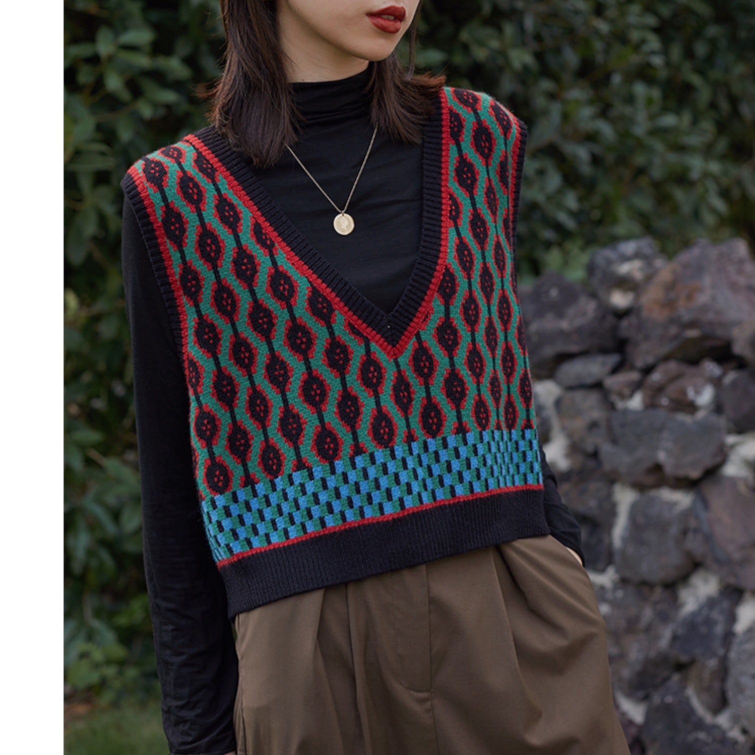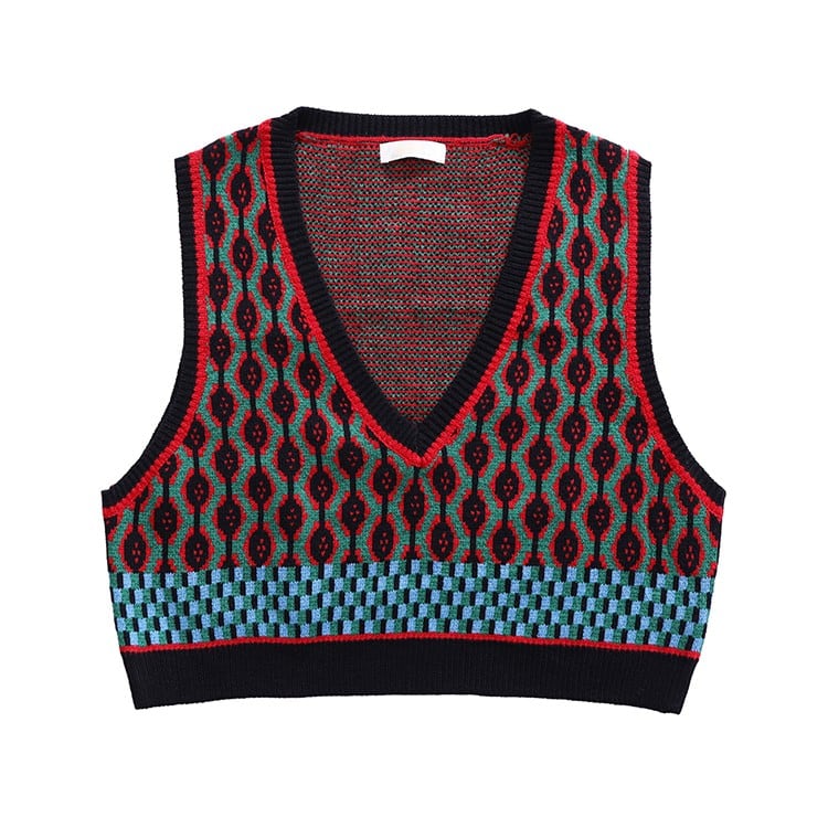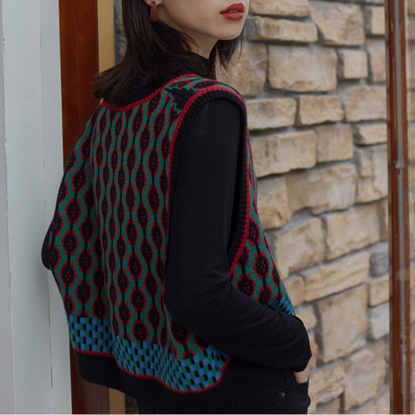 幾何学模様 クロップド丈 Vネックニットベスト 00464