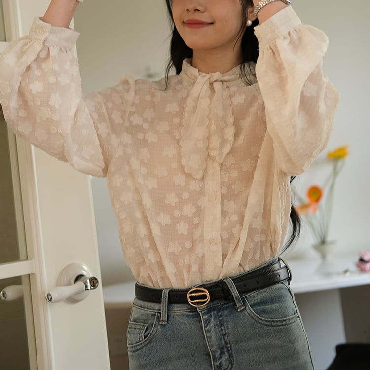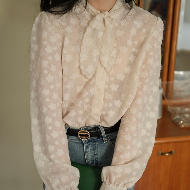 フラワーモチーフ リボンタイ ロングスリーブシフォンブラウス 00470
