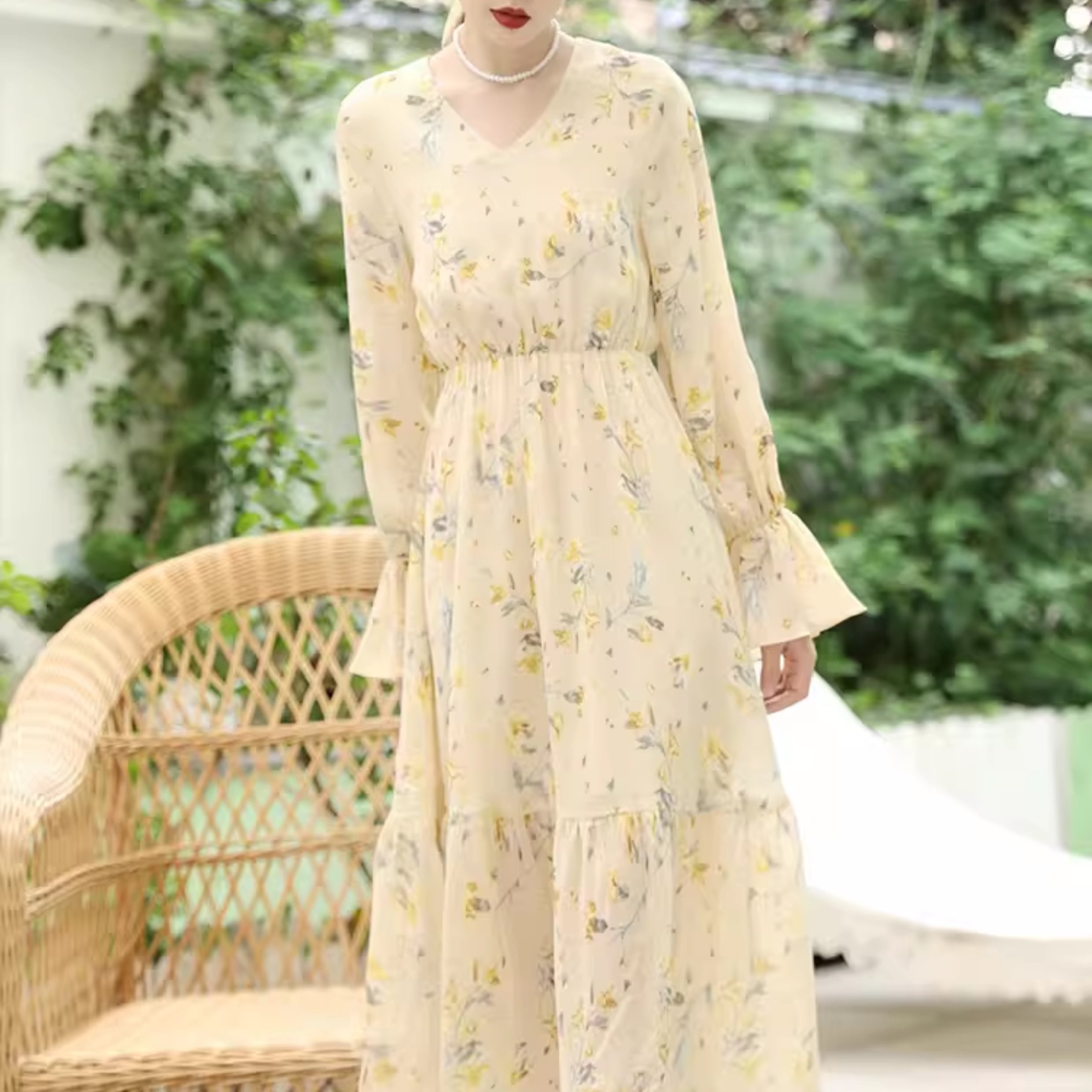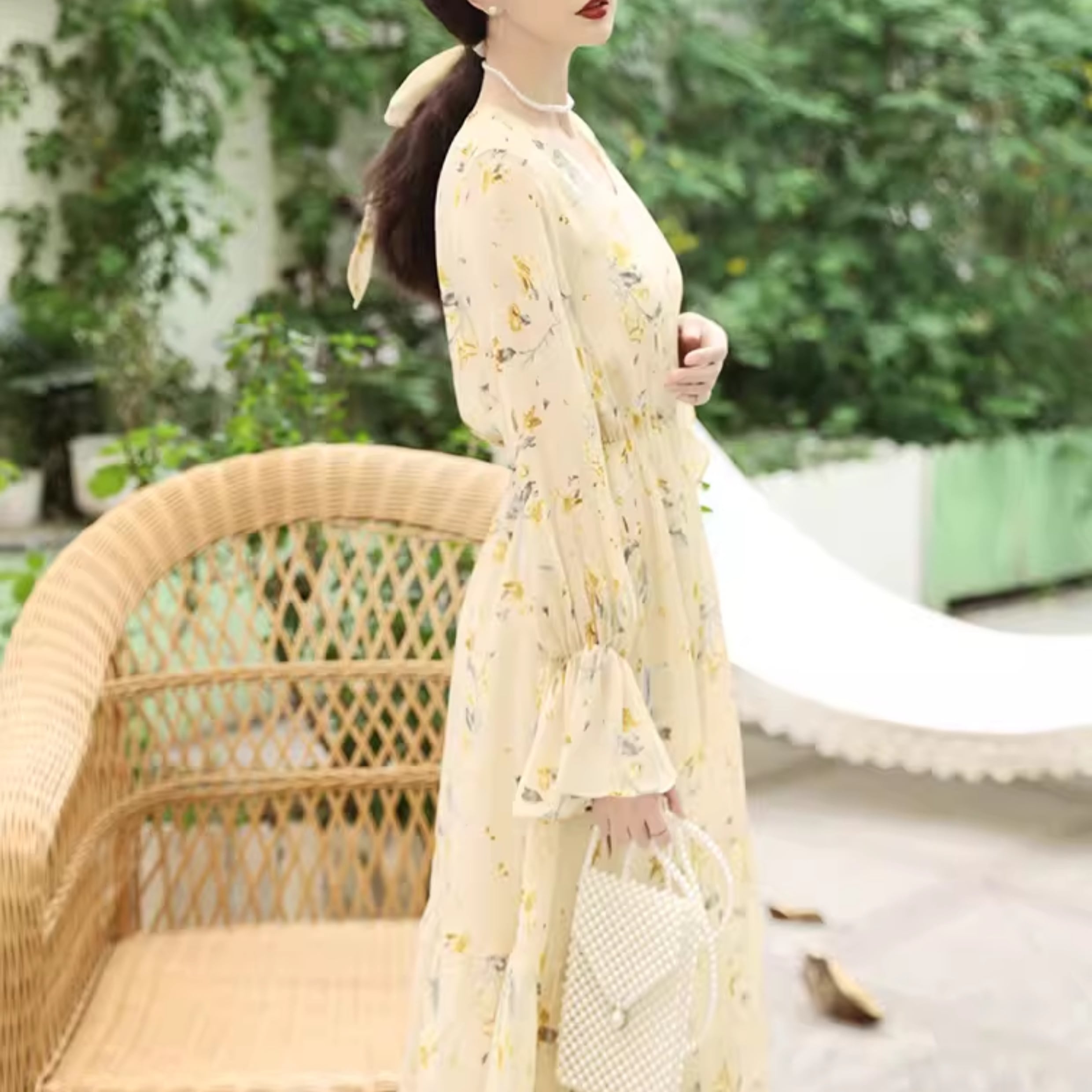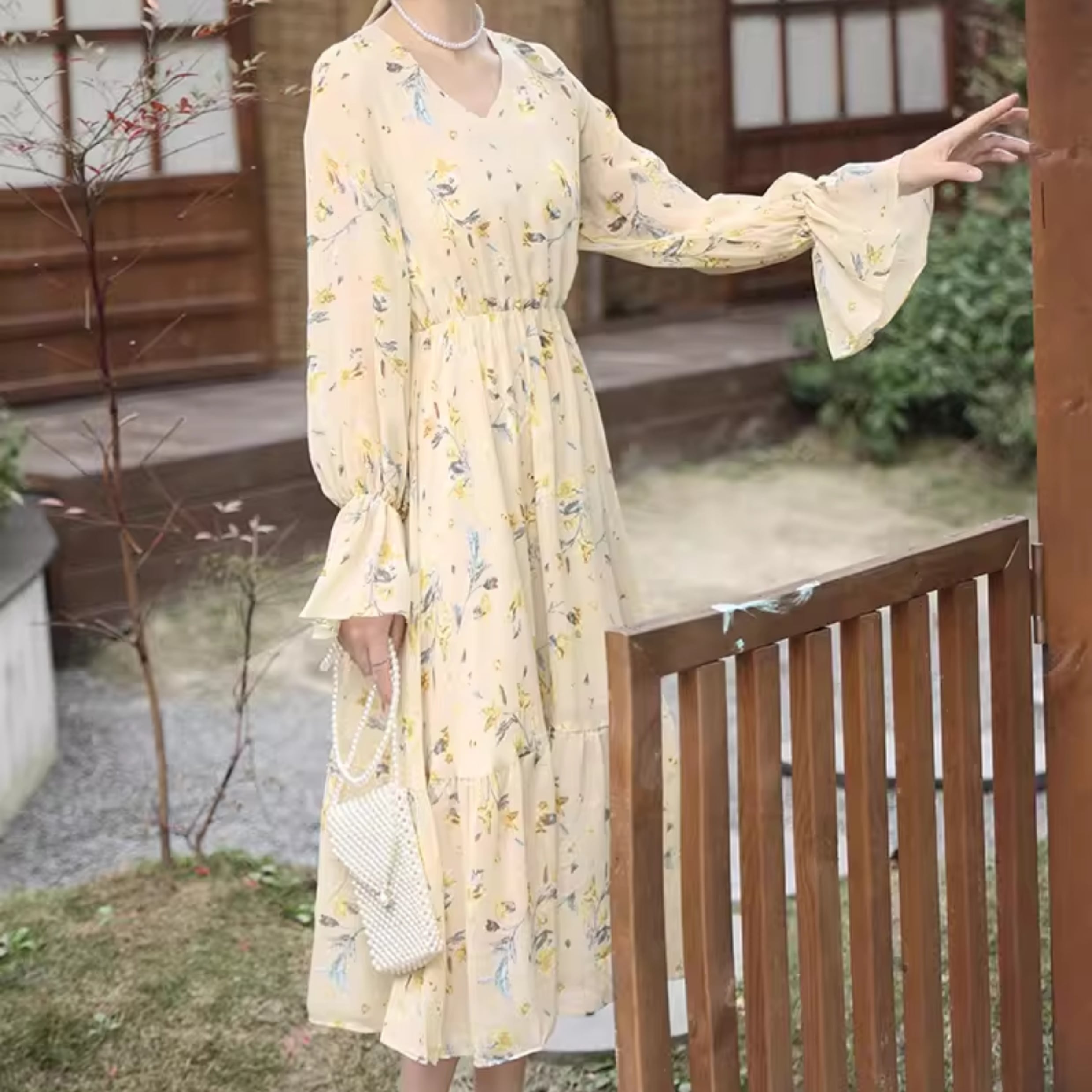 レトロフラワー柄 フリルスリーブ ロングワンピース 00474