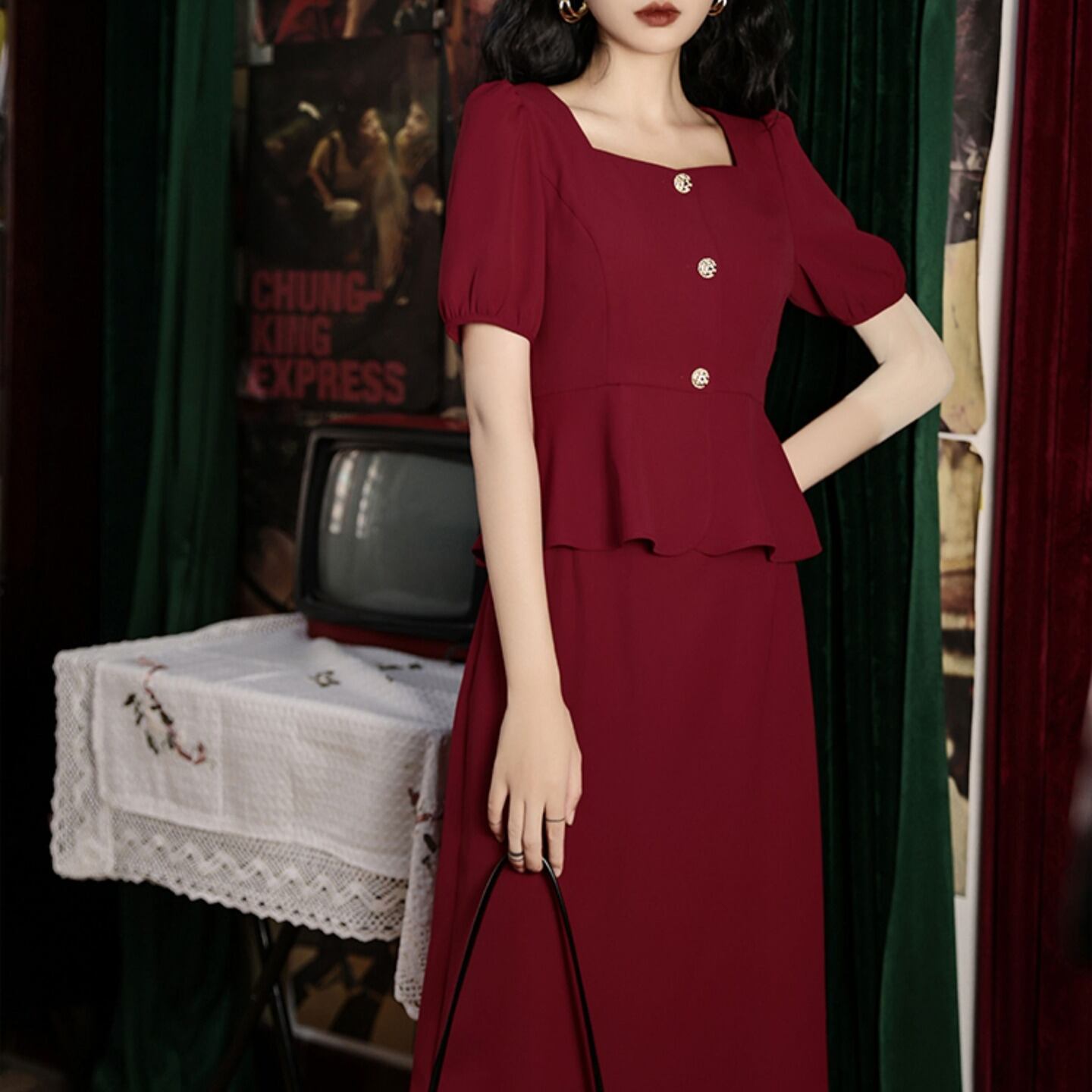 スクエアネックペプラムトップス&スカート セットアップ 00475
