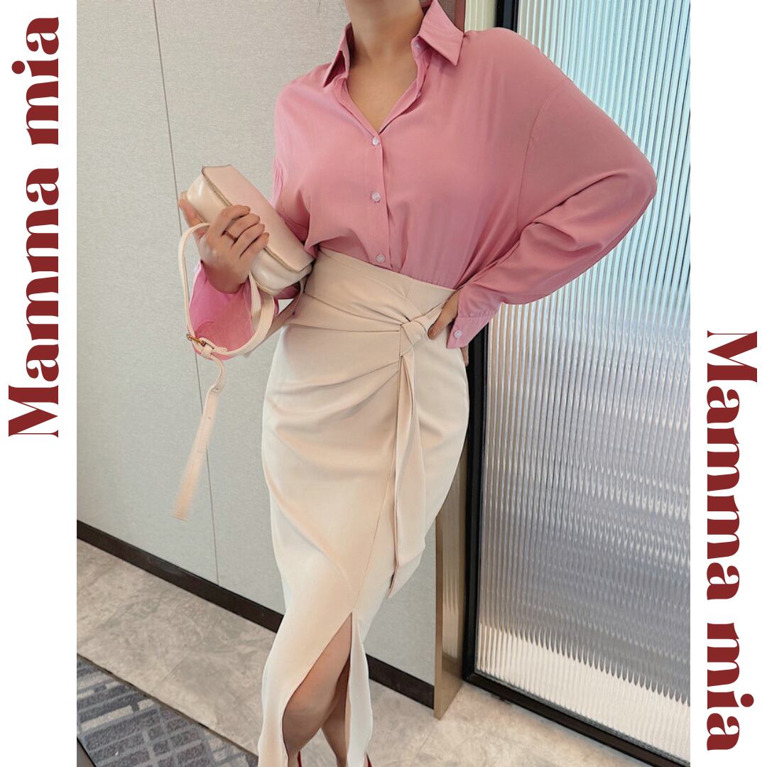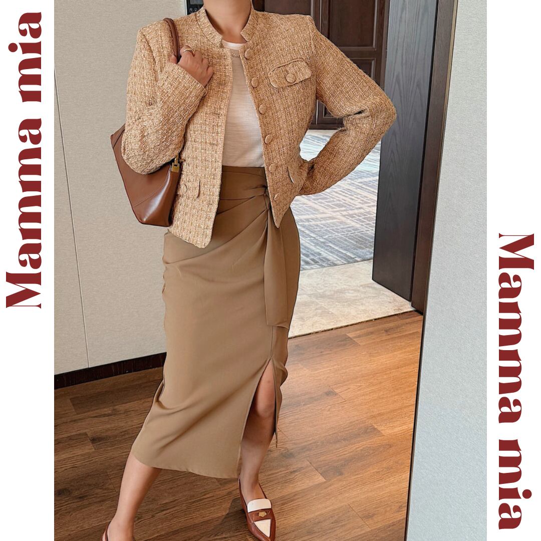 スタイリングを上品に引き締める、ミモレ丈タイトスカート。
