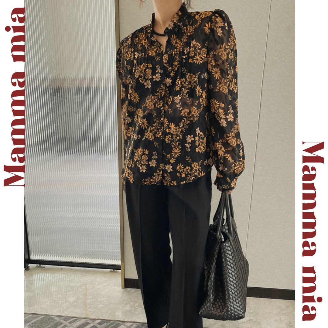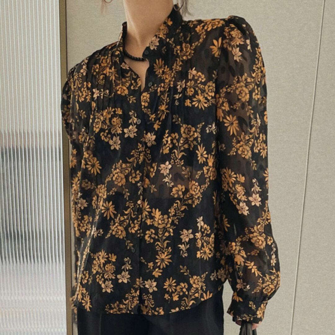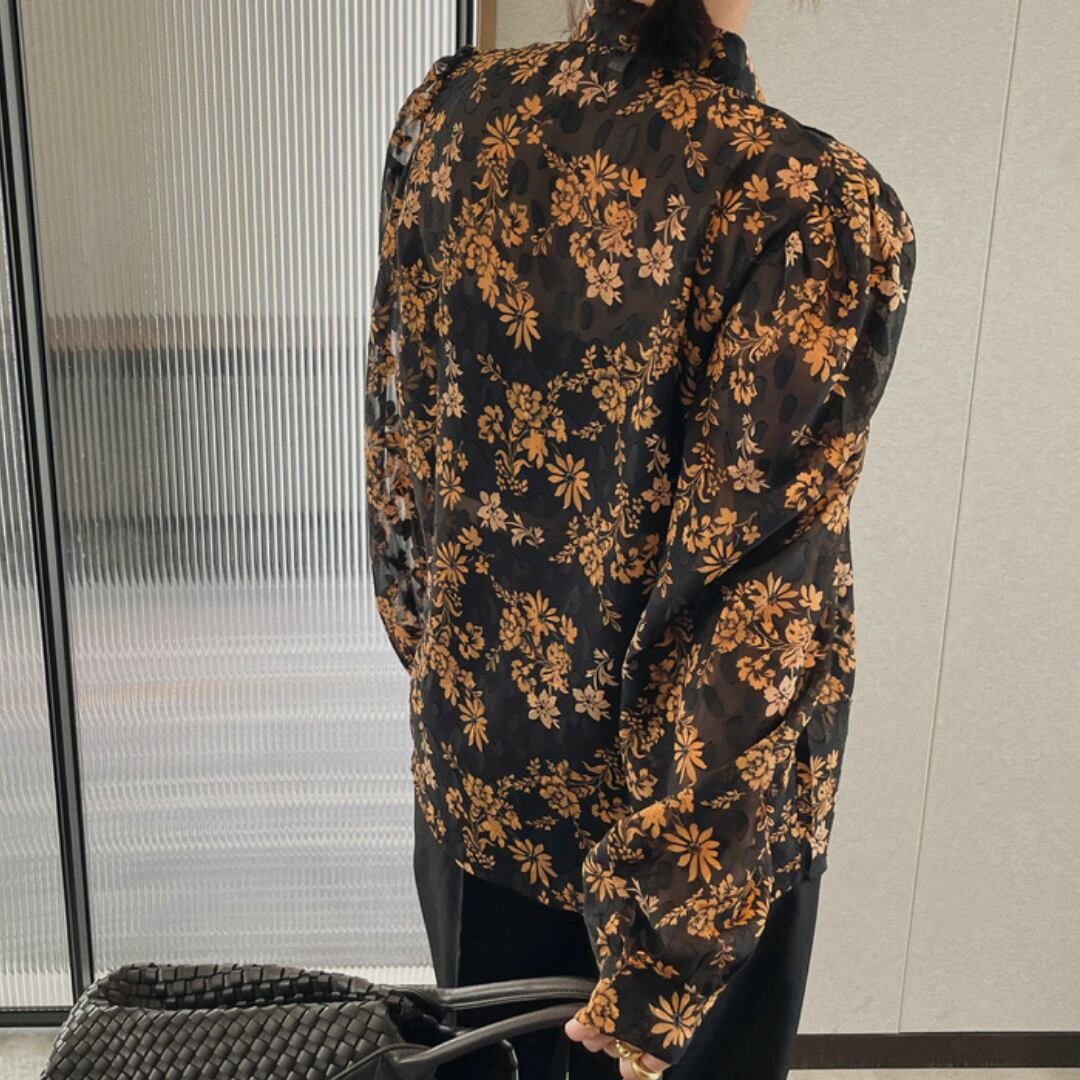 花柄が印象的な長袖ブラウスは、普段の装いを華やかに演出します。
