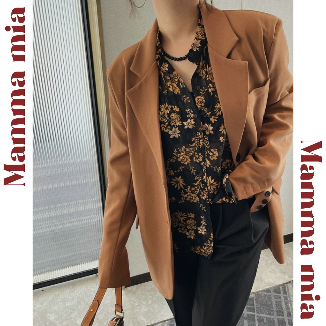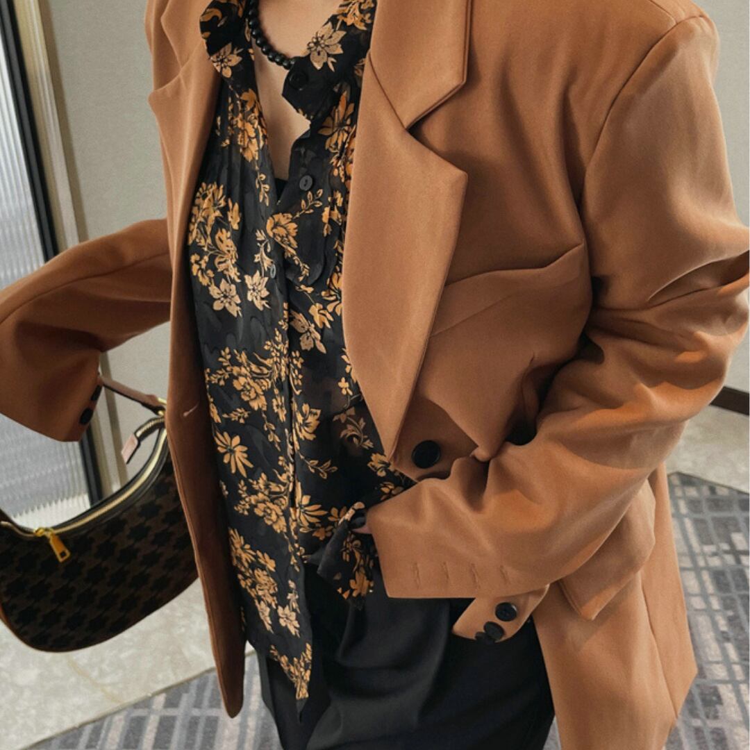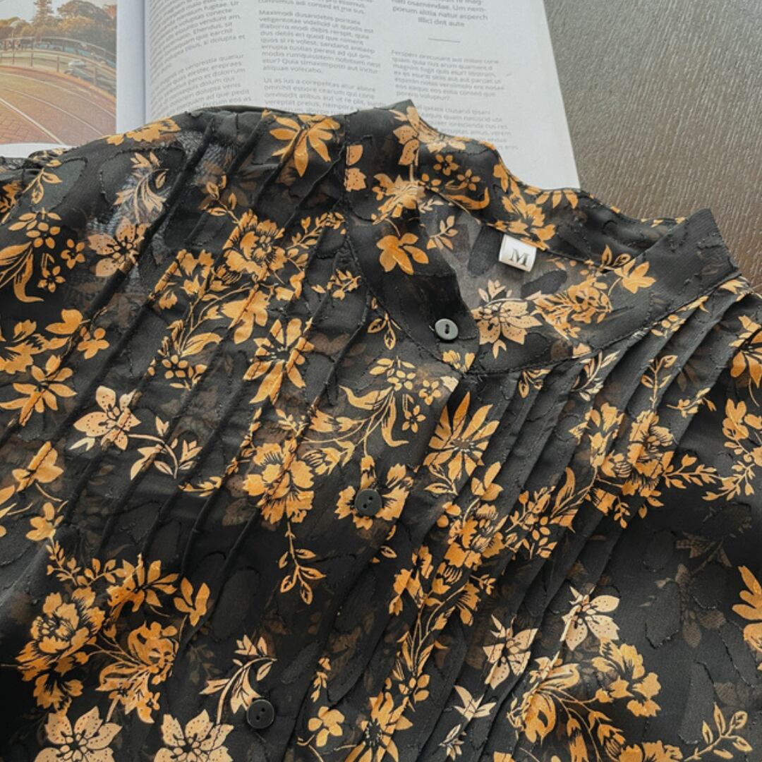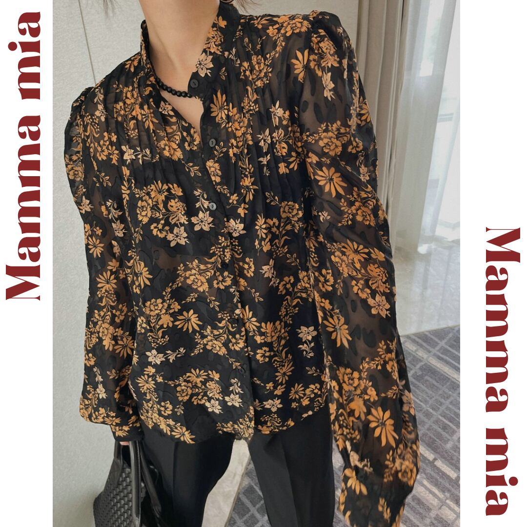 花柄が印象的な長袖ブラウスは、普段の装いを華やかに演出します。