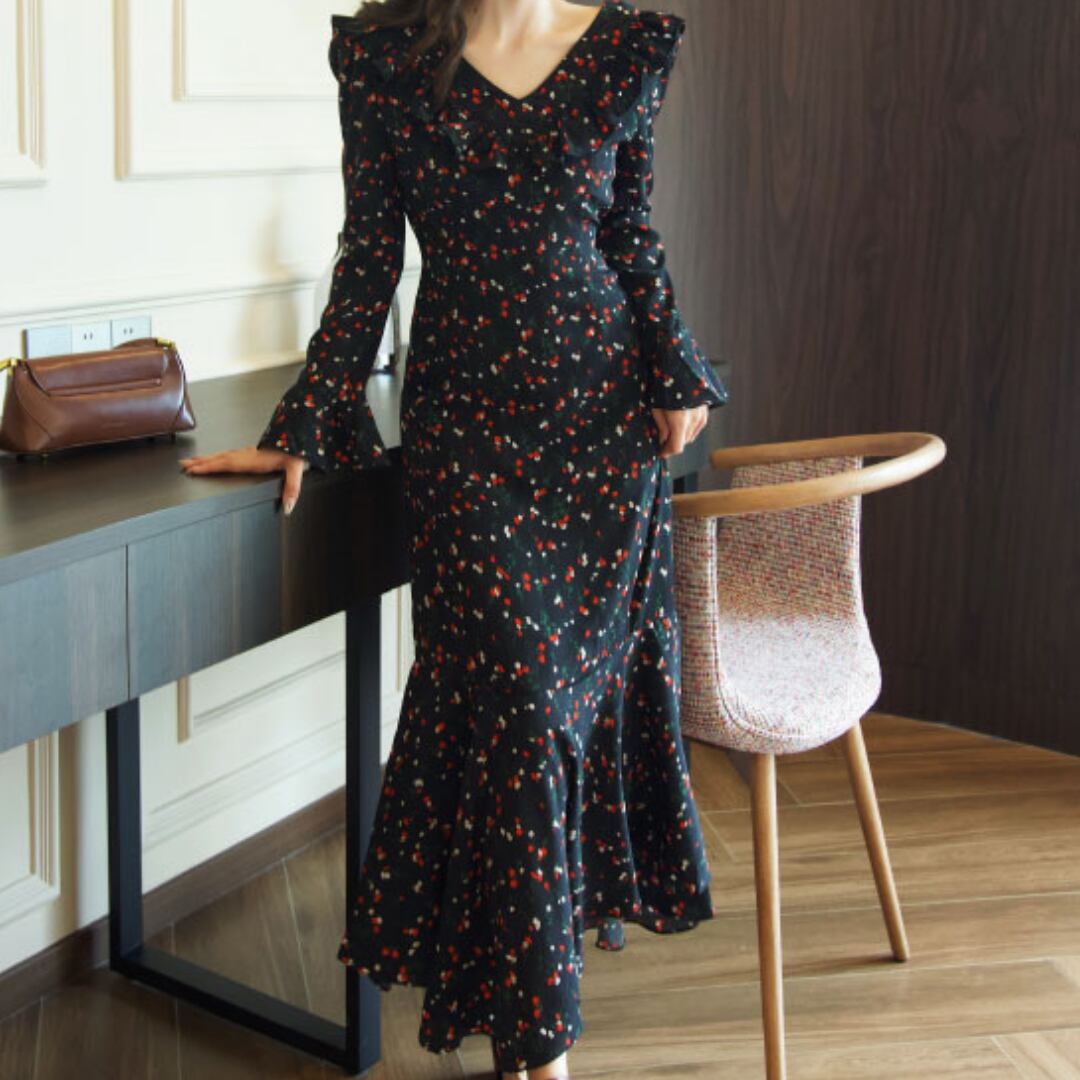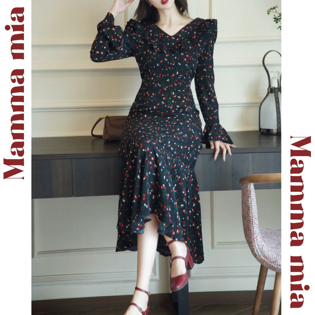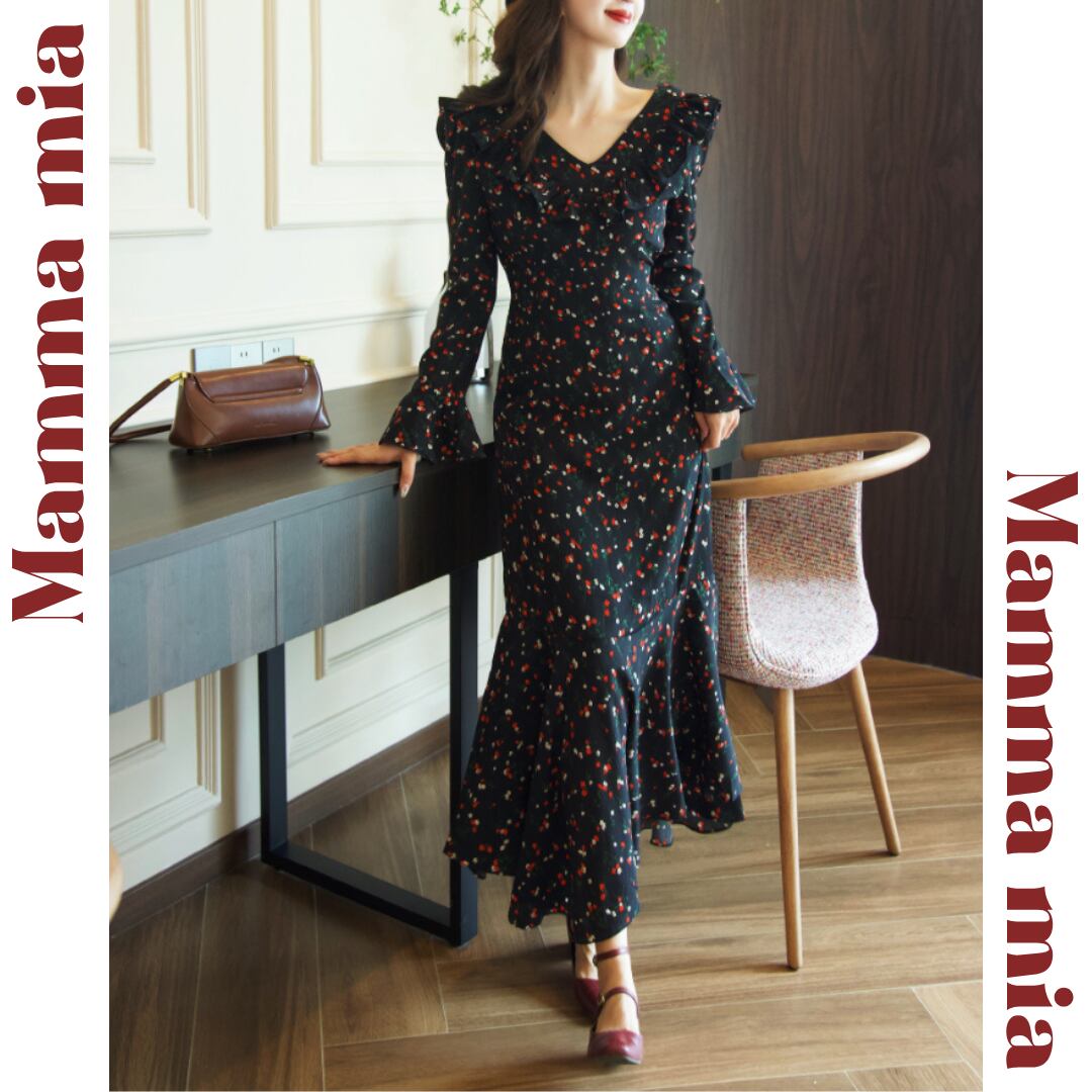 ゆうひな フリルショルダー 長袖 マーメイド ワンピース 00621
