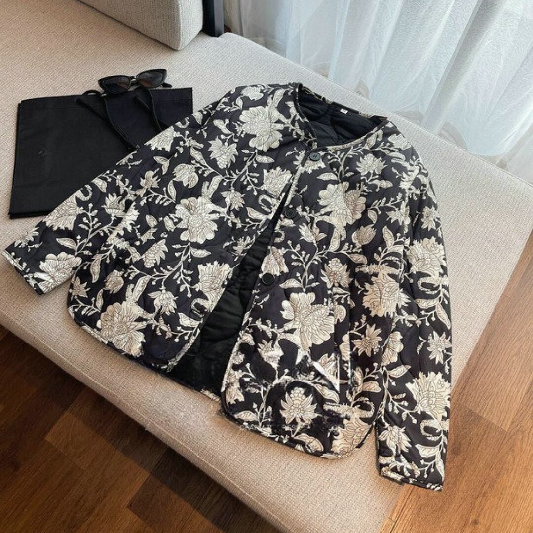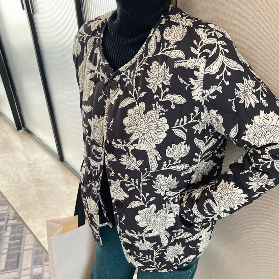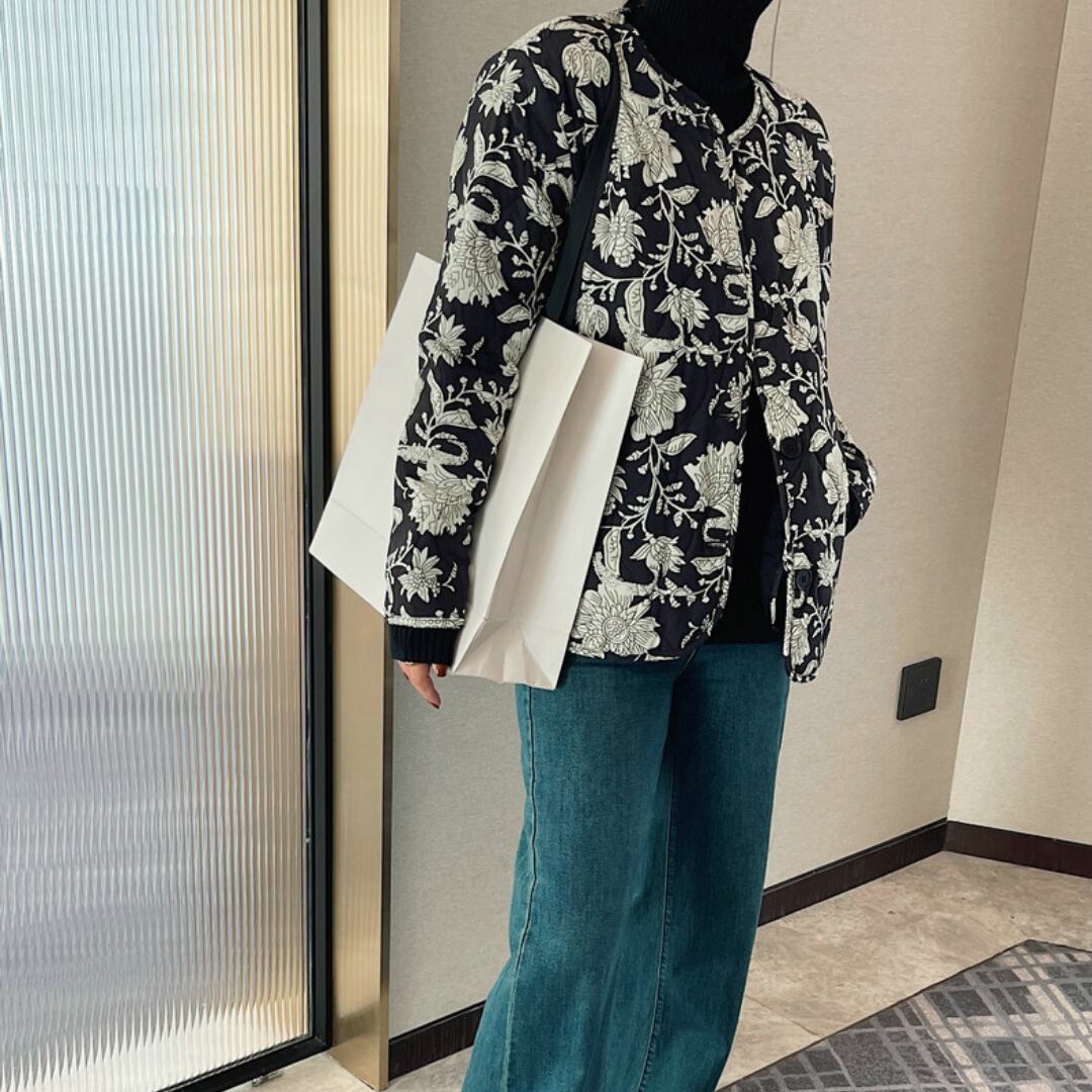 花柄が目を引くジャケットは、シンプルなコーディネートに華やかさを添えます。