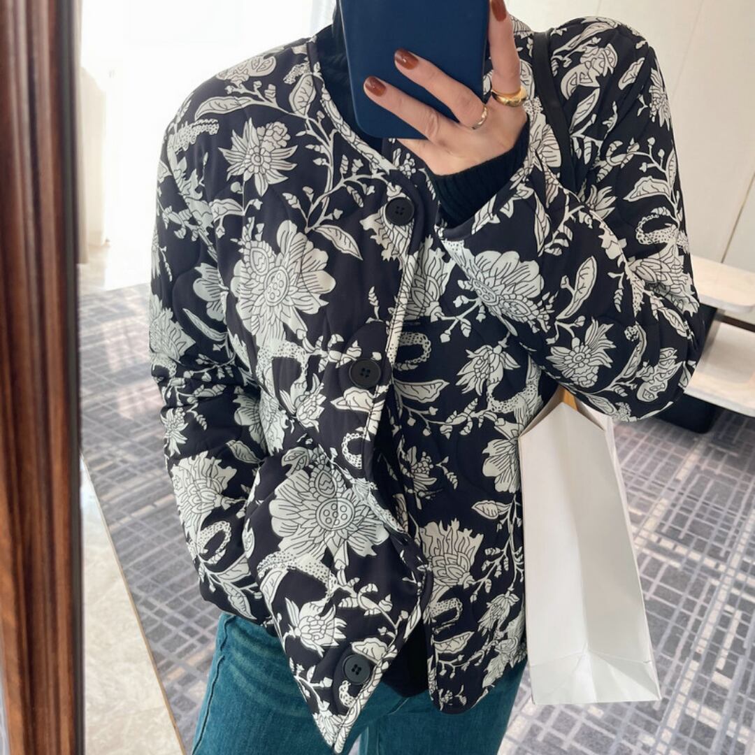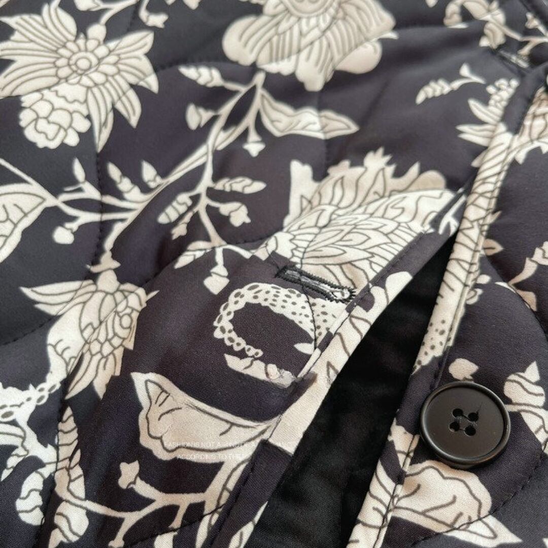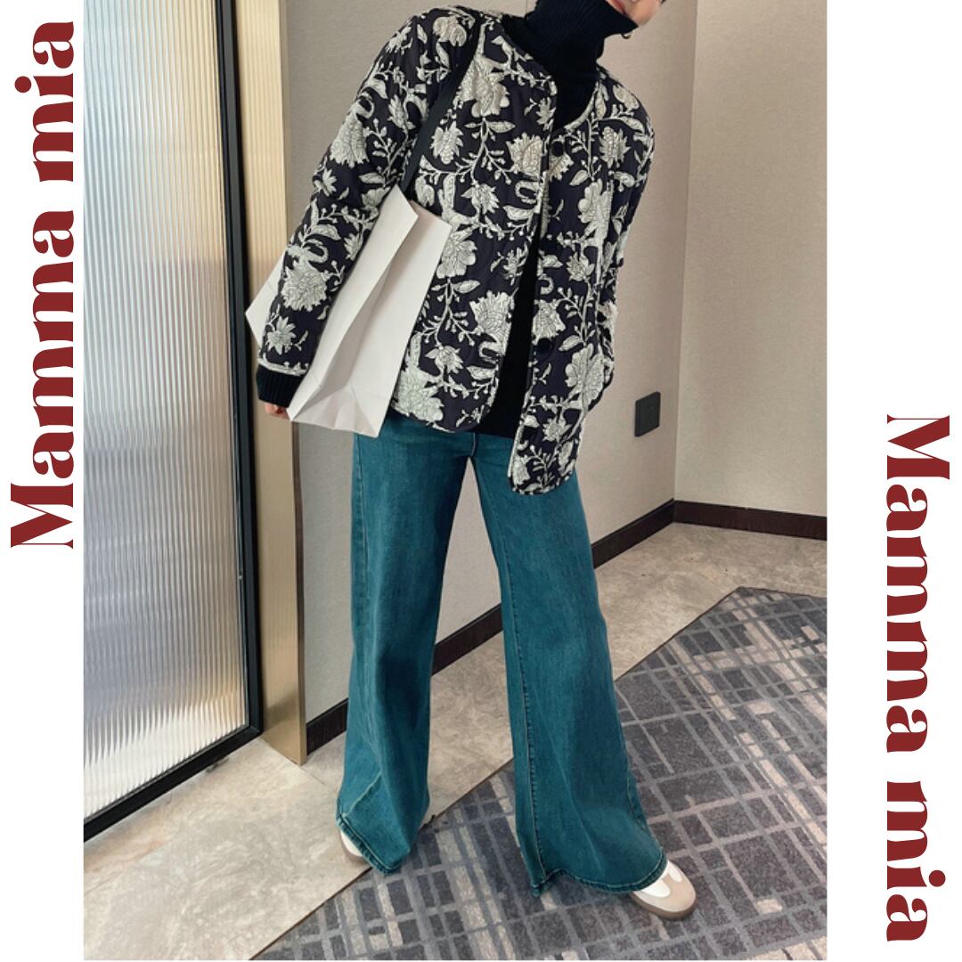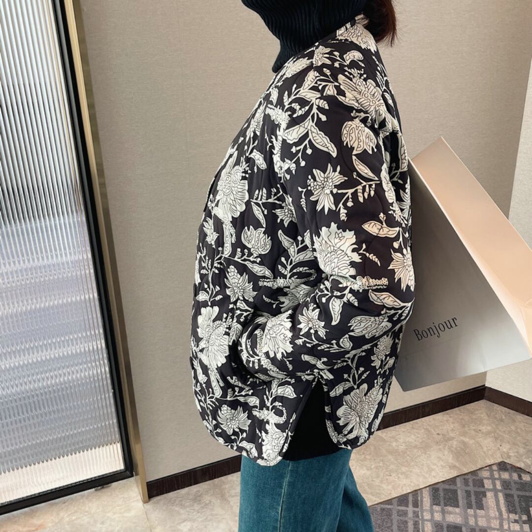 花柄が目を引くジャケットは、シンプルなコーディネートに華やかさを添えます。
