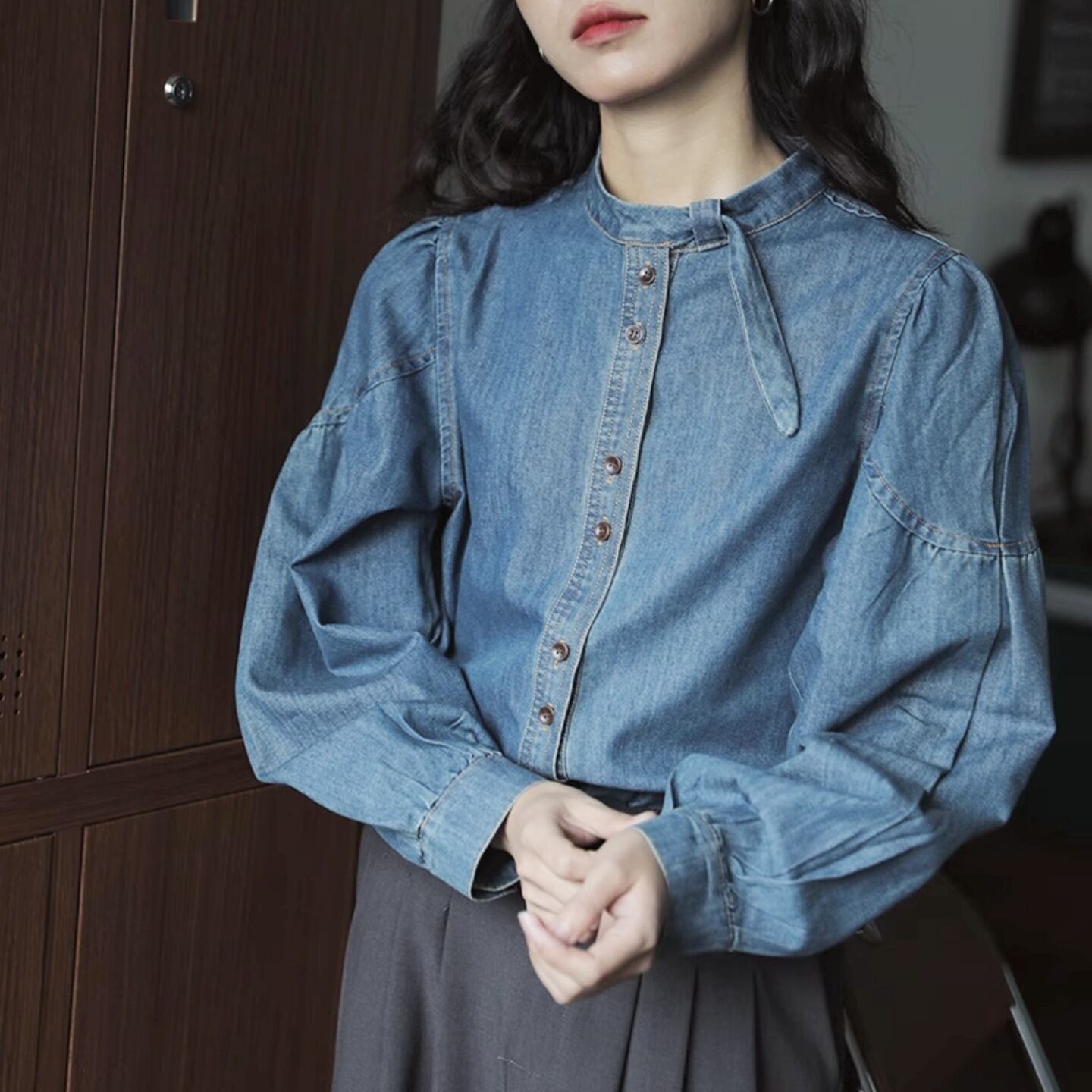 バンドカラーの長袖デニムシャツは、デイリーユースからオフィススタイルまで幅広く活躍するアイテムです。