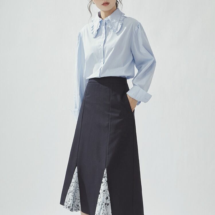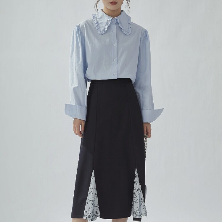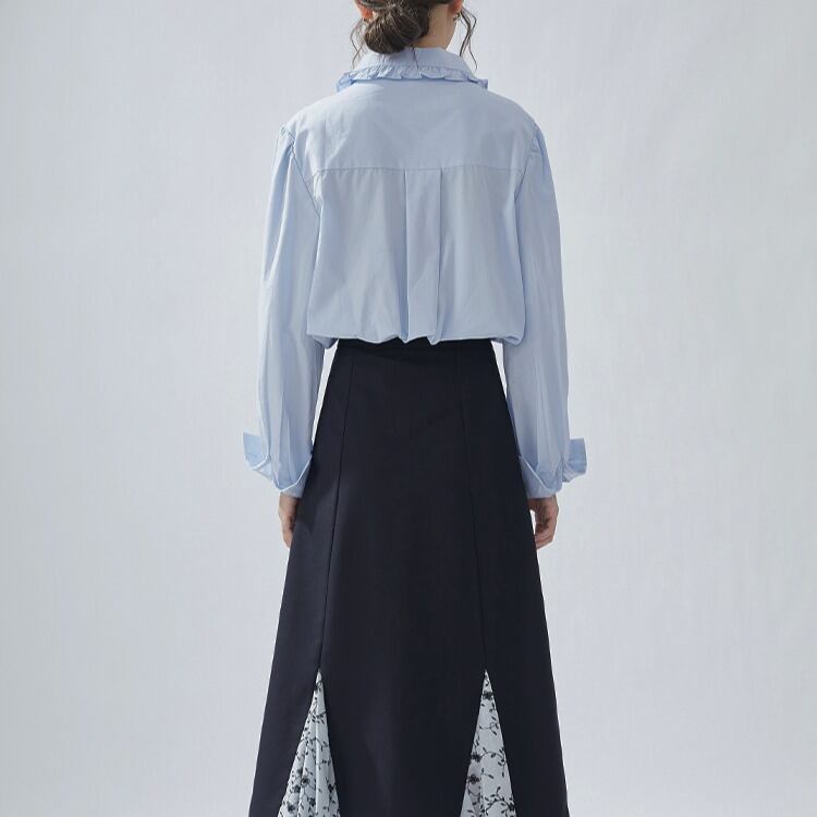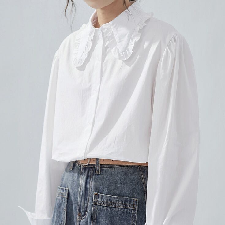 フリルカラーがフェミニンな印象を与えるロングスリーブシャツです。