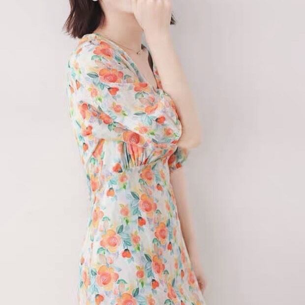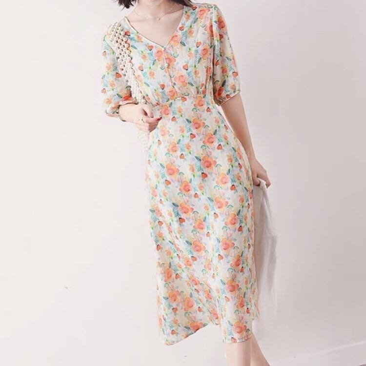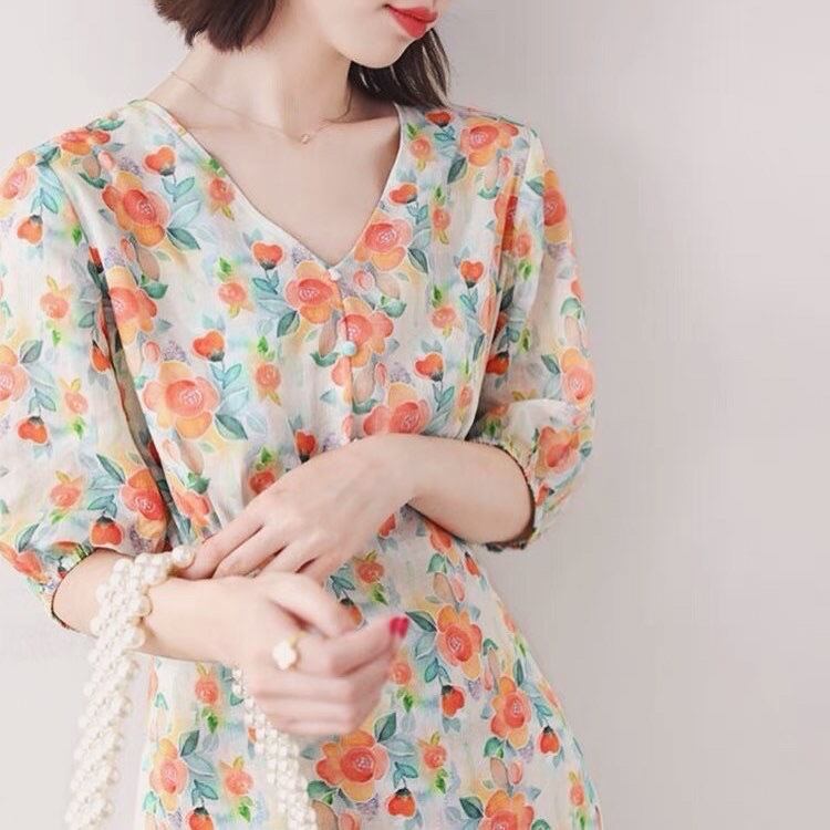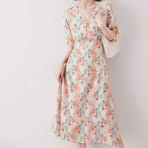 Vネック 花柄 七分袖ワンピース 00183