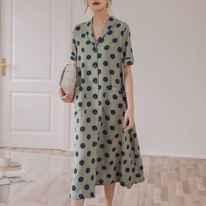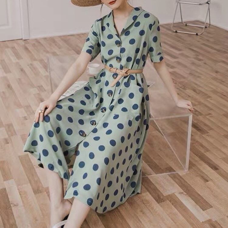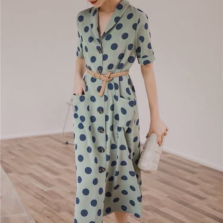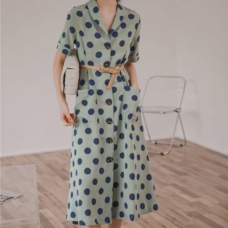 爽やかな水玉柄が軽快な印象を与え、付属のベルトでウエストマークすればスタイルアップも叶います。