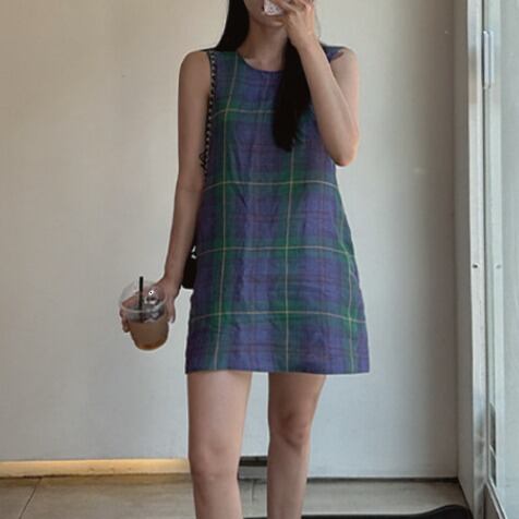 チェック柄ノースリーブAラインミニワンピース 00037